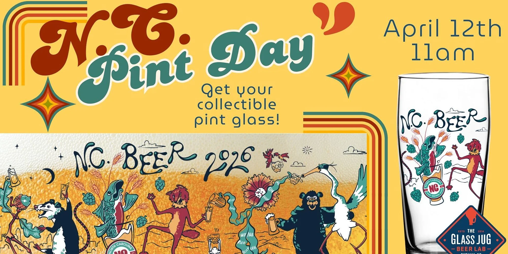 Stop by either Glass Jug location on Sunday, April 12th for NC Pint Day and purchase a limited edition 2026 glass! This year’s glass features all the animals that make our state great, from the white squirrels of Brevard to our state bird, the cardinal. Get the collectible glass alone for $7, or for $6 when filled with a draft pour of any Glass Jug or other NC brewed selection from our menu. $1 from each glass purchase gets donated directly back to the NC Craft Brewers Guild to help support independent NC breweries!