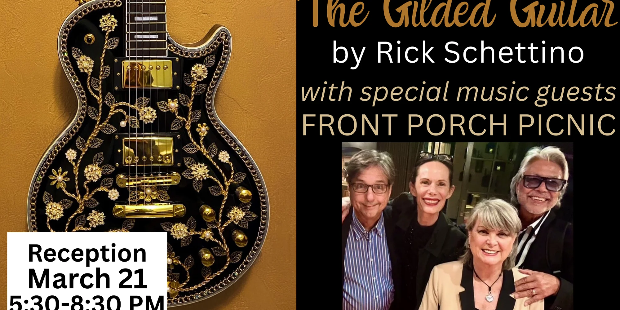 Rick Schettino has lived a life defined by his passion for music and the lure of the road. As a solo singer/songwriter and professional free spirit, Rick spent the past 25 years traversing North America spreading joy through music while working remotely as a freelance art director. Now settled in on the Florida Gulf Coast, Schettino leverages several decades of creative experience to venture into the world of fine art for luxury interiors. Infusing his passion for guitars with his deep-rooted understanding of design, Schettino meticulously transforms new and rescued stringed instruments into "wall jewelry" — elaborate sculptures, melding "found objects" with intensely deliberate design. Each piece is a chronicle of the destruction of high function and complete re-imagination into pure form. Rick Schettino creates one-of-a-kind statement sculptures, simultaneously elegant and opulent, that produce a visual crescendo in any room they inhabit. Front Porch Picnic plays a collection of 20th Century hits in an acoustic setting, with strong vocal harmonies. The band features Paul Wilborn, piano and vocals, Robin Sibucao, guitar and vocals, Sher Sibucao, vocals and whistling, and Eugenie Bondurant, vocals. Front Porch Picnic have appeared at freeFall Theater, New Tampa Performing Arts Center, Dunedin Public Theater, The Studio @ 620, The Palladium Theater, The Muse Awards, and The Fenway Hotel. Paul is known for his bands, Paul and the Pop Tarts, The Big Bar Bills, and Blue Roses. Robin’s long musical career includes recent gigs with the Atlanta Rhythm Section and Coo Coo Ca Choo. Sher has been a featured vocalists in several top Tampa Bay bands. This is a free community event.