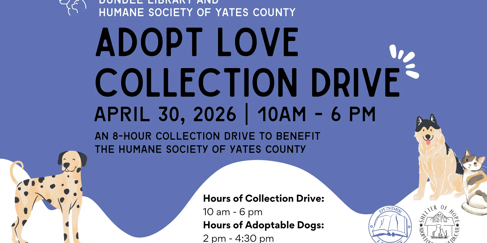 In honor of National Adopt a Shelter Pet Day, the library will host an 8-hour collection drive to support the Humane Society of Yates County. Community members are invited to stop by and donate much-needed items to help support animals in the shelter’s care. Donations such as pet food, toys, cleaning supplies, blankets, and other pet care items are always appreciated. Adding to the excitement, representatives from the Humane Society will be onsite during the event with adoptable dogs, giving visitors the chance to meet some of the animals currently looking for loving homes. Even if you’re not ready to adopt, it’s a wonderful opportunity to learn more about the shelter’s work and show support for the animals they serve. Whether you drop off a donation, stop by to meet the dogs, or simply want to learn more about helping local shelters, your support makes a difference for animals in our community.