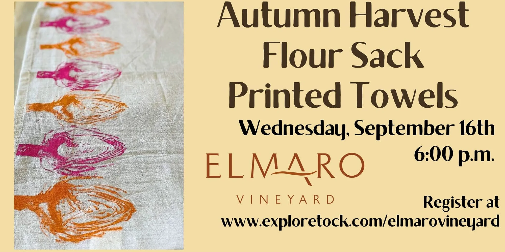 Be reminded of the lushness of the summer growing season with these one of a kind hand printed flour sack towels. In this workshop you will learn the art of fabric printing using veggies and other natural materials. Each participant will leave with 5 printed towels. A variety of neutral and bold paints will be available to choose from. Participants: Feel free to bring 1 pre-washed cotton shirt, bag, or canvas to experiment on after you learn the technique and complete your towels if you like. Register at http://www.exploretock.com/elmarovineyard