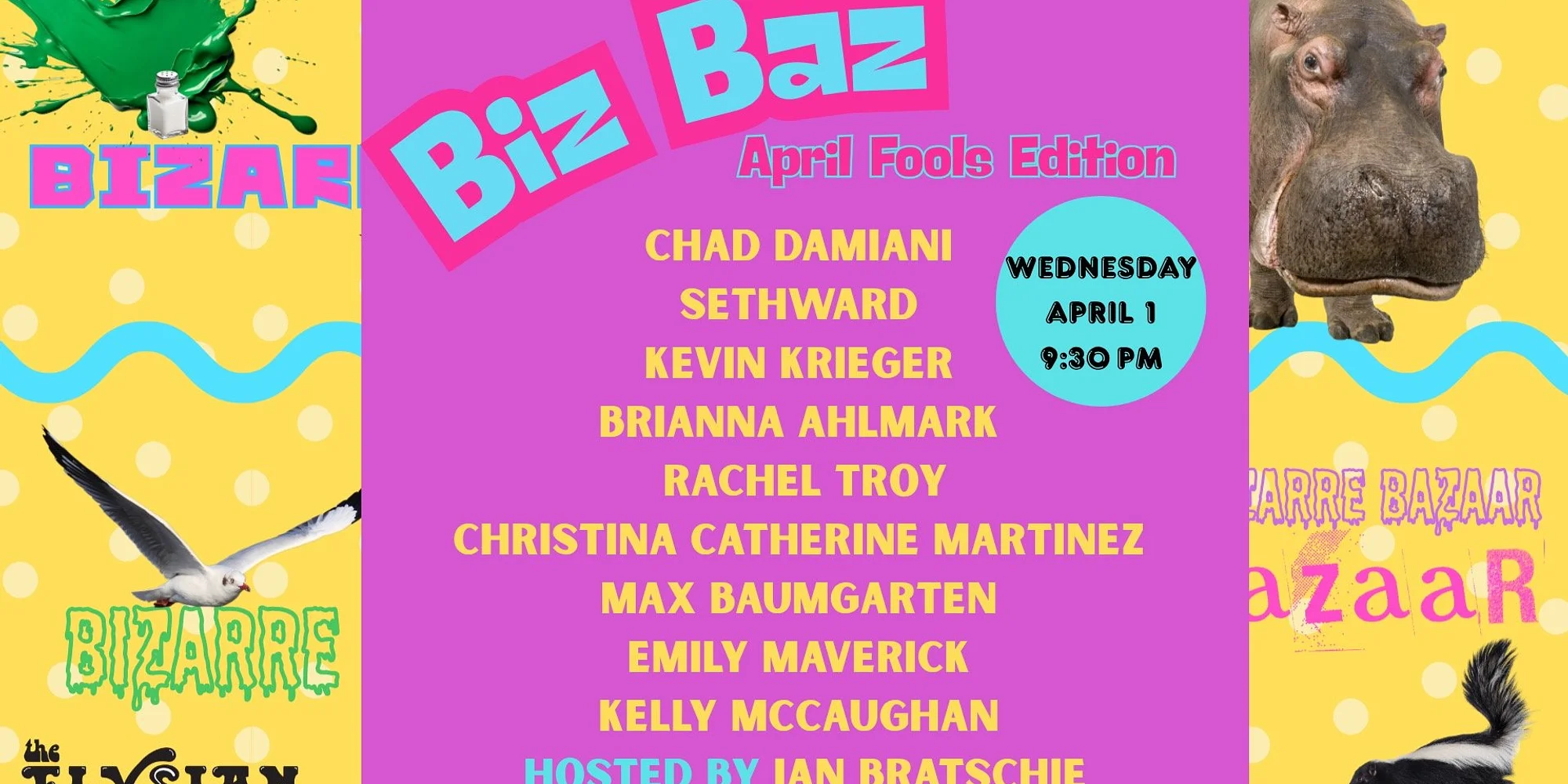 ⭐️ 🥳 ⭐️ 🥳 ⭐️ 🥳 $8 | Buy Tickets Close Buy Tickets Close Bizarre Bazaar is Elysian Theater’s staple variety show, featuring L.A.’s dumbest clowns, smartest stand-ups, sexiest dancers, and any other freaky folk ready to strut their stuff. Hosted by Ian Bratschie and co-produced with the Elysian's Creative Director and Head Booker Jessica Kelley, Biz Baz pairs major comedy names experimenting with bold new material alongside the best clowns in town with music, juggling, dance, magic, and unexpected performance acts. Featuring: Chad Damiani Sethward Kevin Krieger Brihana Ahlmark Rachel Troy Christina Catherine Martinez Max Baumgarten Emily Maverick Kelly McCaughin *Doors open 30 minutes before showtime* Seating is general admission and begins 15 mins before showtime. Late seating is at the discretion of individual shows. Lineup subject to change. Tickets are non-transferable. We do NOT honor tickets from third-party sellers. No Refunds.