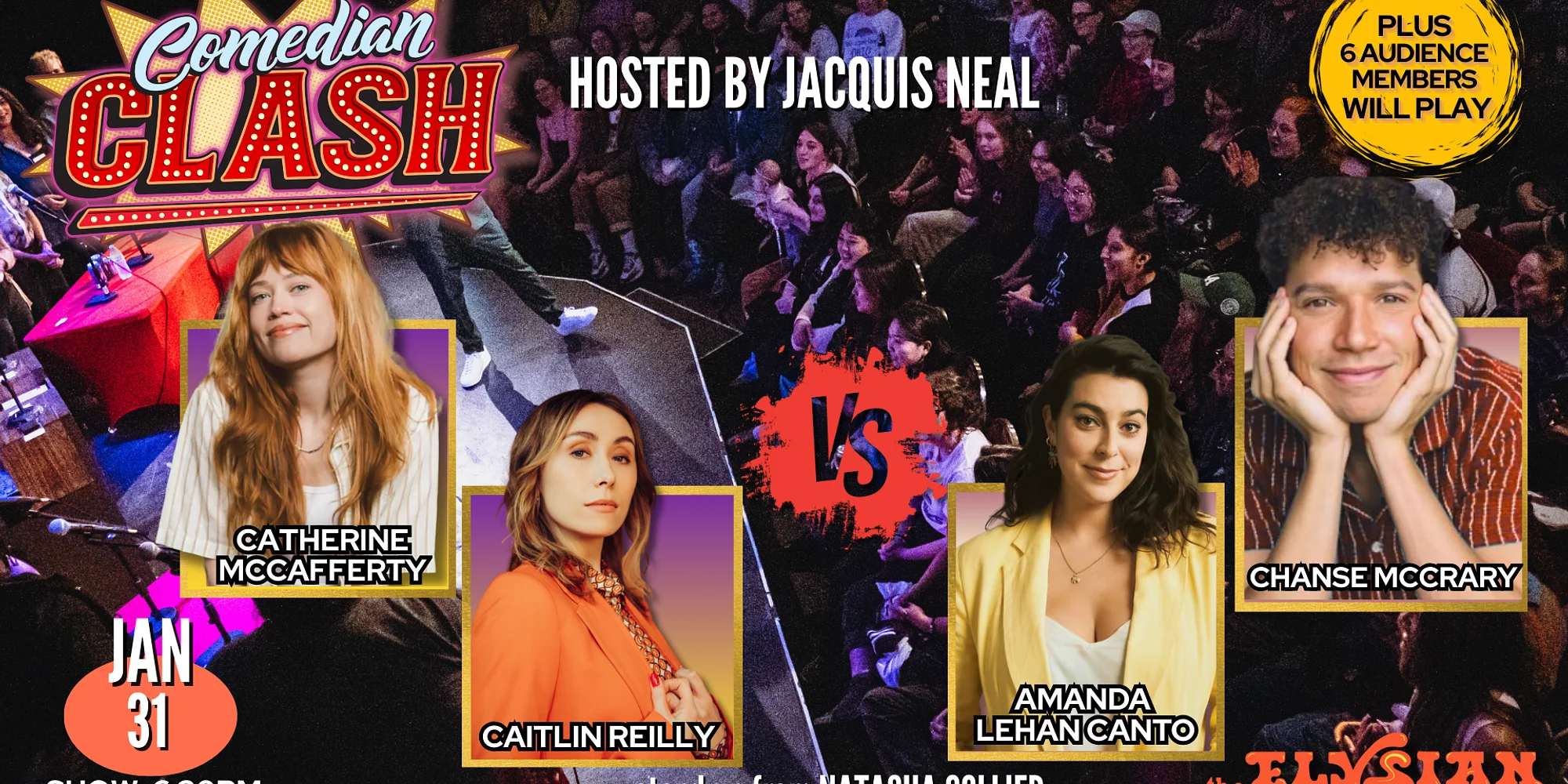💥 〰️ 💥 〰️ 💥 〰️ $20-22 | Buy Tickets Close Buy Tickets Close $15 | LIVESTREAM TICKETS Close Buy Tickets Close Join host Jacquis Neal as he invites some of the best and funniest people in the world to Clash it out, on a game show that tests how well each person can guess the top answers to life's most basic questions that we ask! Plus 6 audience members will have their chance at glory alongside our stars. As we will randomly select willing members from the crowd to play with our stars throughout the show! Real prizes on the line, real answers, real fun! This month's lineup: Caitlin Reilly and Catherine McCafferty vs. Amanda Lehan Canto and Chanse McCrary Stand up by Natasha Collier Join our mailing list for show updates and info, and for the first chance to fill out our questionnaires we use for the show! **LIVESTREAM WILL BE AVAILABLE TO PURCHASE AND WATCH AS VOD FOR 7 DAYS *Doors open 30 minutes before showtime* -Seating begins 15 minutes before showtime, there is NO LATE SEATING. -Seating is general admission - seats are available on a first come first serve basis, from the front of the theater to the back. If you want to sit closer, be sure to arrive earlier. -Shows start no later than 10 MINUTES after the scheduled show time. -We will have a standby line for sold out shows 30 minutes before doors open. If there are no-shows that create open seats, we will be able to sell additional tickets. -In the event of a sold out show, ticketholders who arrive 30 minutes after show start may lose their seats to the standby line. No refunds. *Lineup subject to change *No item minimum *TICKETS ARE NON-TRANSFERABLE | We do NOT honor tickets through third party sellers.