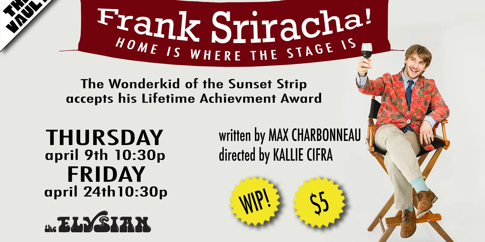 ⭐️🌶️ 〰️ ⭐️🌶️ 〰️ ⭐️🌶️ 〰️ $5 | BUY TICKETS Close Buy Tickets Close Frank Sriracha has been dazzling audiences for decades as the Wonderkid of the Sunset Strip. Tonight, he is honored to receive his Lifetime Achievement Award. The brief reception will be followed by a massive catered dinner with an open bar: all he has to do is give his Big Speech. Created by Max Charbonneau (@corndudemax). Directed by Kallie Cifra (@kalliecifra). This show is going to be at the Hollywood Fringe literally just you wait you'll see. *Doors open 15 minutes before showtime* Seating is general admission and begins 15 mins before showtime. Late seating is at the discretion of individual shows. Lineup subject to change. Tickets are non-transferable. We do NOT honor tickets from third-party sellers. No Refunds.