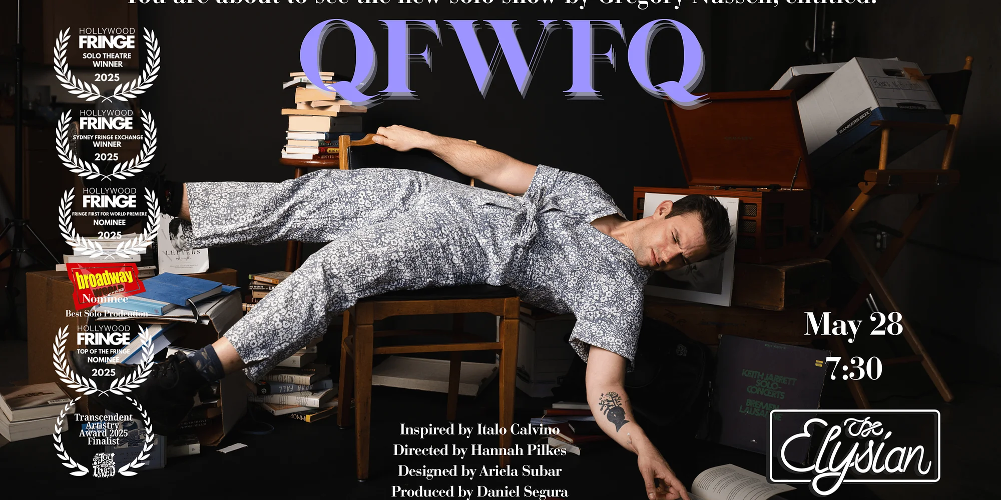 📚 〰️ 📚 〰️ 📚 〰️ $16-20 | BUY TICKETS Close Buy Tickets Close Winner of Best Solo Theatre and the Sydney Fringe Exchange at the 2025 Hollywood Fringe, with an additional three nominations including Top of Fringe, and a BroadwayWorld LA nomination for Best Solo Production. QFWFQ is inspired by If On a Winter’s Night a Traveler and other works by the Italian post-modern author Italo Calvino. Touching on improvised music, Zionism, the genocide in Gaza, architectural marvels and trans identity, QFWFQ is a show that neither begins, nor ends. You’re confused. So are we. Catch it before it heads to Edinburgh and Australia. Director: Hannah Pilkes Designer: Ariela Subar Producer: Daniel Segura Gregory Nussen is a multidisciplinary artist from Los Angeles. Off-Broadway: Caliban in The Tempest (CSC), Jess Burkle & Tony Speciale’s A Four-Letter Word (CSC/Plastic Theatre/World Event Young Artists in the UK); Other NYC: shows with Piehole, Pulse Ensemble. The Diary, their previous solo show, premiered at Theater for the New City. Regional: Christopher in The Curious Incident of the Dog in the Night-time (Phoenix Theatre Company). LA: several shows with Theatre of NOTE, Theater West, The Odyssey, Red Ink Ensemble, UCB, The Groundlings. Gregory is also the Lead Film Critic for Screen Rant, an NYFCC award-winning critic with additional bylines in Deadline, Slant, In Review Online, Backstage, Salon, Knock-LA and others. MFA, Columbia. AEA, SAG-AFTRA, GALECA. gregnussen.com *Doors open 30 minutes before showtime* Seating begins 15 minutes before showtime, there is NO LATE SEATING you may lose their seat(s) to the standby line without refunds. Seating is general admission - seats are available on a first come first serve basis, from the front of the theater to the back. If you want to sit closer, be sure to arrive earlier. We will have a standby line for sold out shows 30 minutes before doors open. If there are no-shows that create open seats, we will be able to sell additional tickets. In the event of a sold out show, ticketholders who arrive 30 minutes after show start may lose their seats to the standby line. No refunds. *Lineup subject to change* TICKETS ARE NON-TRANSFERABLE | We do NOT honor tickets through third party sellers.