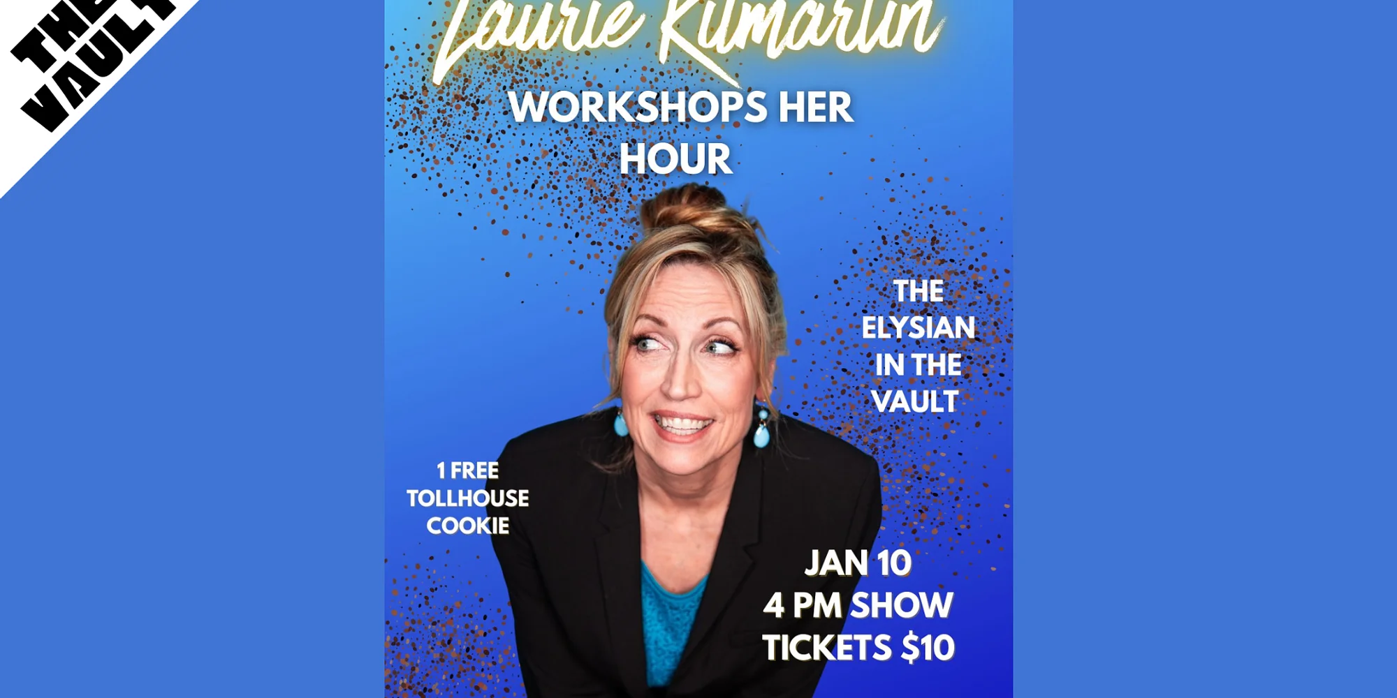 🍪 〰️ 🍪 〰️ 🍪 〰️ $10-15 | Buy Tickets Close Buy Tickets Close Comedian and writer Laurie Kilmartin can't get any work done in this town of 8 min sets. At the Vault, she works out her new hour, and also, there are free Tollhouse cookies. *Doors open 15 minutes before showtime* -Seating begins 15 minutes before showtime, there is NO LATE SEATING. -Seating is general admission - seats are available on a first come first serve basis, from the front of the theater to the back. If you want to sit closer, be sure to arrive earlier. -Shows start no later than 10 MINUTES after the scheduled show time. -We will have a standby line for sold out shows 30 minutes before doors open. If there are no-shows that create open seats, we will be able to sell additional tickets. -In the event of a sold out show, ticketholders who arrive 30 minutes after show start may lose their seats to the standby line. No refunds. *Lineup subject to change *No item minimum *TICKETS ARE NON-TRANSFERABLE | We do NOT honor tickets through third party sellers.