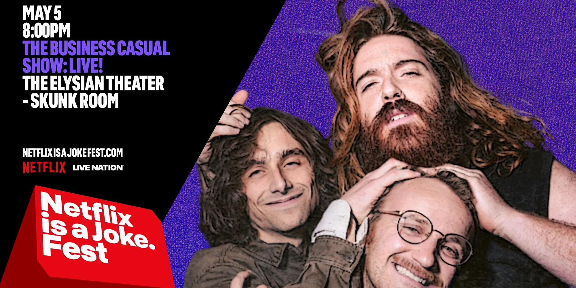 ⭐️ 〰️ ⭐️ 〰️ ⭐️ 〰️ $20 | Buy Tickets Close Buy Tickets Close The Business Casual Show is a comedy podcast by sketch trio Business Casual. Every week, Jeremy Elder, Hunter Saling and Cory Peter Lane prepare surprise segments to present to their guest and co-hosts. From games like “Guess the Soup” to a 100 Oyster Feast, there's no bit these boys aren't willing to commit to. Join them LIVE in Los Angeles for the best live podcast experience in the brief history of humankind. This event is 18+ *Doors at 7:00 PM* Seating is general admission - seats are available on a first come first serve basis, from the front of the theater to the back. If you want to sit closer, be sure to arrive earlier. We will have a standby line for sold out shows 30 minutes before doors open. If there are no-shows that create open seats, we will be able to sell additional tickets. In the event of a sold out show, ticketholders who arrive 30 minutes after show start may lose their seats to the standby line. No refunds. *Lineup subject to change* TICKETS ARE NON-TRANSFERABLE | We do NOT honor tickets through third party sellers.
