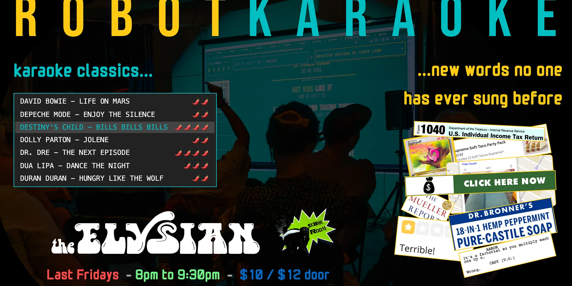 🤖 〰️ 🤖 〰️ 🤖 〰️ 4/24 | BUY TICKETS Close Buy Tickets Close Join us for karaoke night on impossible mode as we replace the lyrics to any SONG with words from a specific TEXT, then try to sing the results on the spot. Our songwriting system, THE WEIRD ALGORITHM, matches each line syllable-for-syllable so you can sing along if you know the tune. It all happens live: each song has never been heard before and will never be heard again. Request any of the 100+ songs and 50+ texts in the catalog. Past combos include: YELP REVIEWS OF PSYCHICS to the tune of TOTAL ECLIPSE OF THE HEART CRAIGSLIST VEHICLE ADS to the tune of TAKE ME HOME COUNTRY ROADS NEGATIVE REVIEWS OF PROFESSORS to the tune of VAMPIRE BERNIE SANDERS EMAIL SUBJECT LINES to the tune of DON'T STOP BELIEVIN' Singers will include local comedians, karaoke ringers and audience volunteers. Sign up as an individual or a group...or sit back and watch the karaoke carnage. Tickets are $10 adv/$12 day of. *Doors open 30 minutes before showtime* Seating begins 15 minutes before showtime, there is NO LATE SEATING you may lose their seat(s) to the standby line without refunds. Seating is general admission - seats are available on a first come first serve basis, from the front of the theater to the back. If you want to sit closer, be sure to arrive earlier. We will have a standby line for sold out shows 30 minutes before doors open. If there are no-shows that create open seats, we will be able to sell additional tickets. In the event of a sold out show, ticketholders who arrive 30 minutes after show start may lose their seats to the standby line. No refunds. *Lineup subject to change* TICKETS ARE NON-TRANSFERABLE | We do NOT honor tickets through third party sellers.