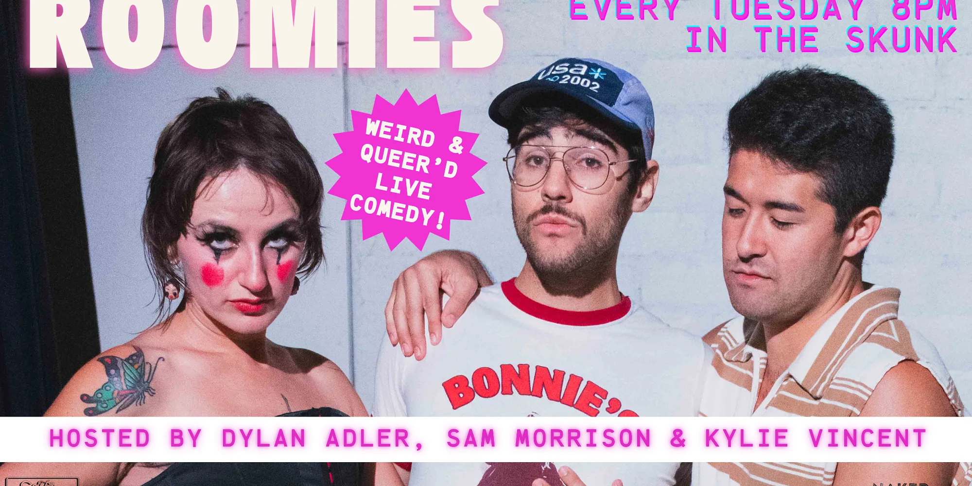 🛌 👄 🛌 👄 🛌 👄 EX roomies Dylan Adler (Late Late Show) & Sam Morrson (JFL) lived together for 2 years in harmony in Brooklyn, until Dylan betrayed Sam by moving to LA. After years of spreading heinous rumors behind each other’s back on their respective coasts, these two confirmed bachelors reunite along with Kylie Vincent to put on the most unhinged, fundamentally evil showcase of comedic talent. But Roomies is more than just a comedy show, it's a weird & queer'd community of comedians, clowns, musicians, and community care organizations! Join us in supporting local aid groups with monthly grocery drives, kit building activities, information sharing and more! So come through, pull up a bean bag, have a cold bev and enjoy new unpredictable comedy & community experiences every week!! Produced by Naked Comedy, Jacketoff Pro, Elyza Halpern & Taylor Doherty Follow our hosts! @dylanadler_ @samuelhmorrison & Meta hates Kylie so find her at https://beacons.ai/kylievincent AND Follow our producers! @nakedcomedy @jacketoffpro @possumgirl_ig & @mnemosynth GET TIX BELOW↓↓ 4/7 | *FREE RSVP HERE* Close Buy Tickets Close 4/14 | BUY TICKETS Close Buy Tickets Close 4/21 | BUY TICKETS Close Buy Tickets Close 4/28 | BUY TICKETS Close Buy Tickets Close *Doors open 30 minutes before showtime* Seating is general admission and begins 15 mins before showtime. Late seating is at the discretion of individual shows. No Refunds. Lineup subject to change. Tickets are non-transferable. We do NOT honor tickets from third-party sellers.