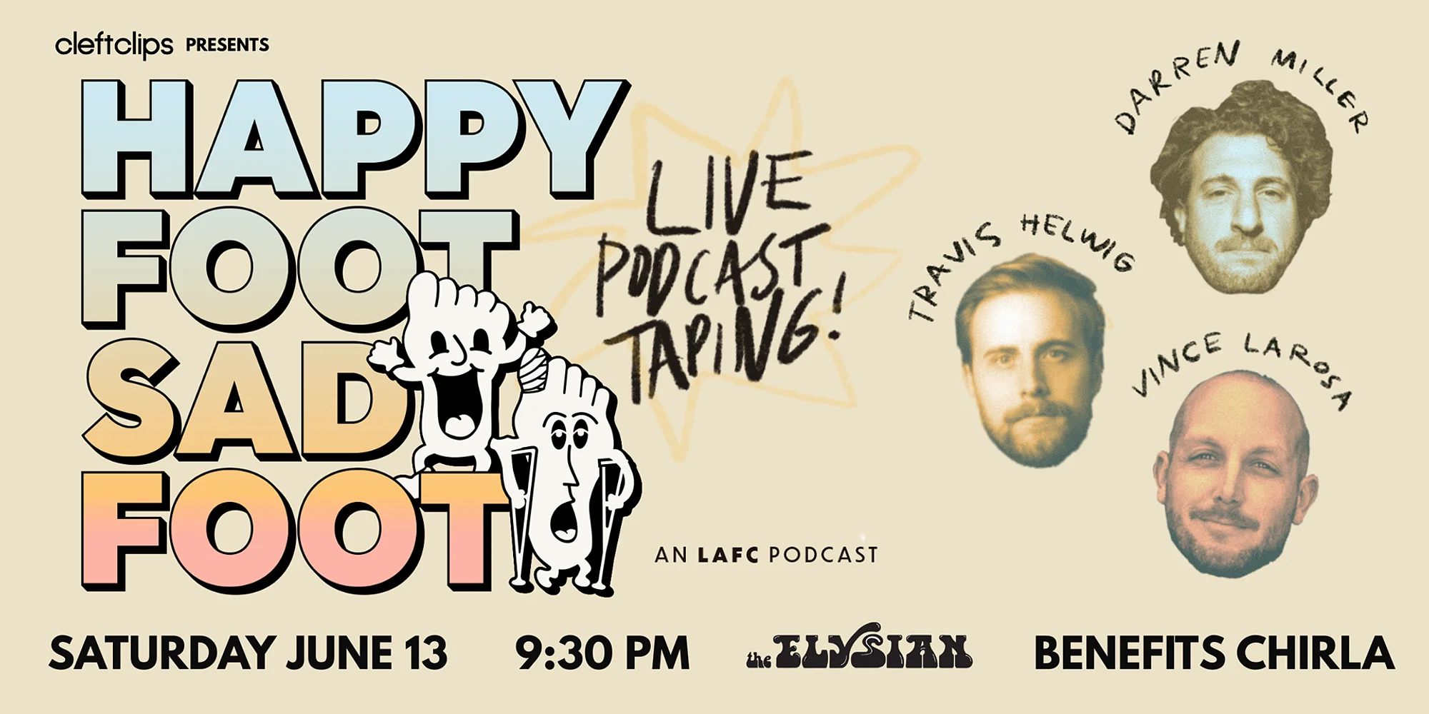 🦶 〰️ 🦶 〰️ 🦶 〰️ THIS PERFORMANCE IS SOLD OUT. A LIMITED NUMBER OF TICKETS WILL BE AVAILABLE AT THE DOOR. $20-30 | STANDBY ONLY Close Buy Tickets Close The best LAFC podcast named after a sign in front of podiatrists office that closed like three years ago. Hosted by comedy writers Travis Helwig and Darren Miller, and soccer expert Vince La Rosa, this podcast is the easiest way for new fans to fall in love with our club, and the most fun place for current LAFC fans to keep up with the team. Happy Foot Sad Foot is your gateway drug to Los Angeles Football Club. Tickets will benefit CHIRLA: https://www.chirla.org/ More Happy Foot Sad Foot: https://happyfootsadfootpod.com/ *Doors open 30 minutes before showtime* Seating begins 15 minutes before showtime, there is NO LATE SEATING you may lose their seat(s) to the standby line without refunds. Seating is general admission - seats are available on a first come first serve basis, from the front of the theater to the back. If you want to sit closer, be sure to arrive earlier. We will have a standby line for sold out shows 30 minutes before doors open. If there are no-shows that create open seats, we will be able to sell additional tickets. In the event of a sold out show, ticketholders who arrive 30 minutes after show start may lose their seats to the standby line. No refunds. *Lineup subject to change* TICKETS ARE NON-TRANSFERABLE | We do NOT honor tickets through third party sellers.