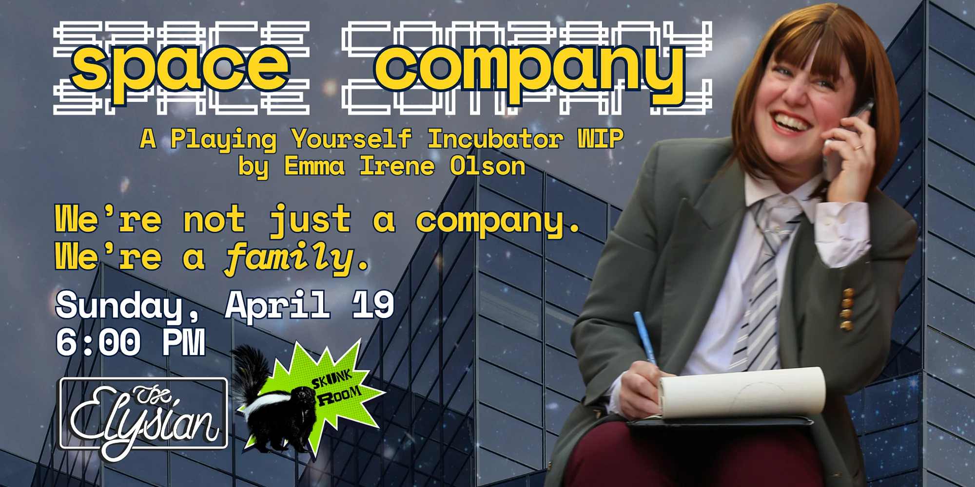 💼 〰️ 💼 〰️ 💼 〰️ $10-12 | BUY TICKETS Close Buy Tickets Close Welcome to your first day at Space Company!! We’re not just a company — we’re a FAMILY. Allow your new manager (but please, call her “Mom”, since we are a family) to orient you to the Space Company family. Experience the wonder and ingenuity of American corporate culture and witness Space Company's innovation, growth, efficiency, and profitability at all costs in order to become "The Best Company In The Universe". Devised and performed by Emma Irene Olson (she/they), this is a work-in-progress immersive corporate satire that that asks the perennial question: “What do we do after we destroy that?”. Developed in Playing Yourself, The Elysian's solo show devising workshop led by Artistic Director Jacquelyn Landgraf. *Doors open 30 minutes before showtime* Seating is general admission and begins 15 mins before showtime. Late seating is at the discretion of individual shows. Lineup subject to change. Tickets are non-transferable. We do NOT honor tickets from third-party sellers. No Refunds.