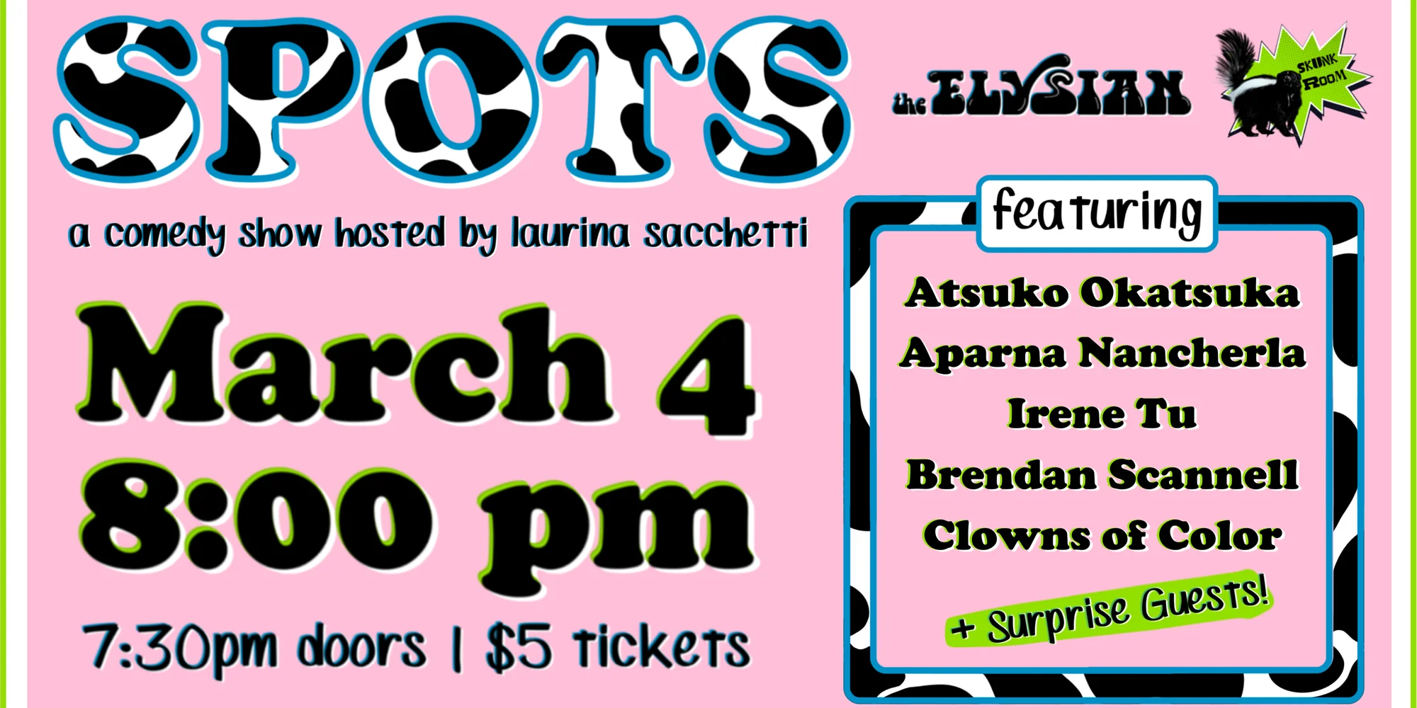 🎤 〰️ 🎤 〰️ 🎤 〰️ $5-10 | BUY TICKETS Close Buy Tickets Close NEW ELYSIAN STANDUP SHOW We needed more spots. Comedians needed more stage time. So we made a chaos show. Pop-up lineups. Surprise drop-ins. All three rooms. First one: Wednesday 3/4 @ 8pm Featuring: Atsuko Okatsuka, Aparna Nancherla, Irene Tu, Brendan Scannell, Clowns of Color + SURPRISE GUESTS If you like seeing great comics before everyone else does — this is your show. #spots *Doors open 30 minutes before showtime* Seating begins 15 minutes before showtime, there is NO LATE SEATING you may lose their seat(s) to the standby line without refunds. Seating is general admission - seats are available on a first come first serve basis, from the front of the theater to the back. If you want to sit closer, be sure to arrive earlier. We will have a standby line for sold out shows 30 minutes before doors open. If there are no-shows that create open seats, we will be able to sell additional tickets. In the event of a sold out show, ticketholders who arrive 30 minutes after show start may lose their seats to the standby line. No refunds. *Lineup subject to change* TICKETS ARE NON-TRANSFERABLE | We do NOT honor tickets through third party sellers.