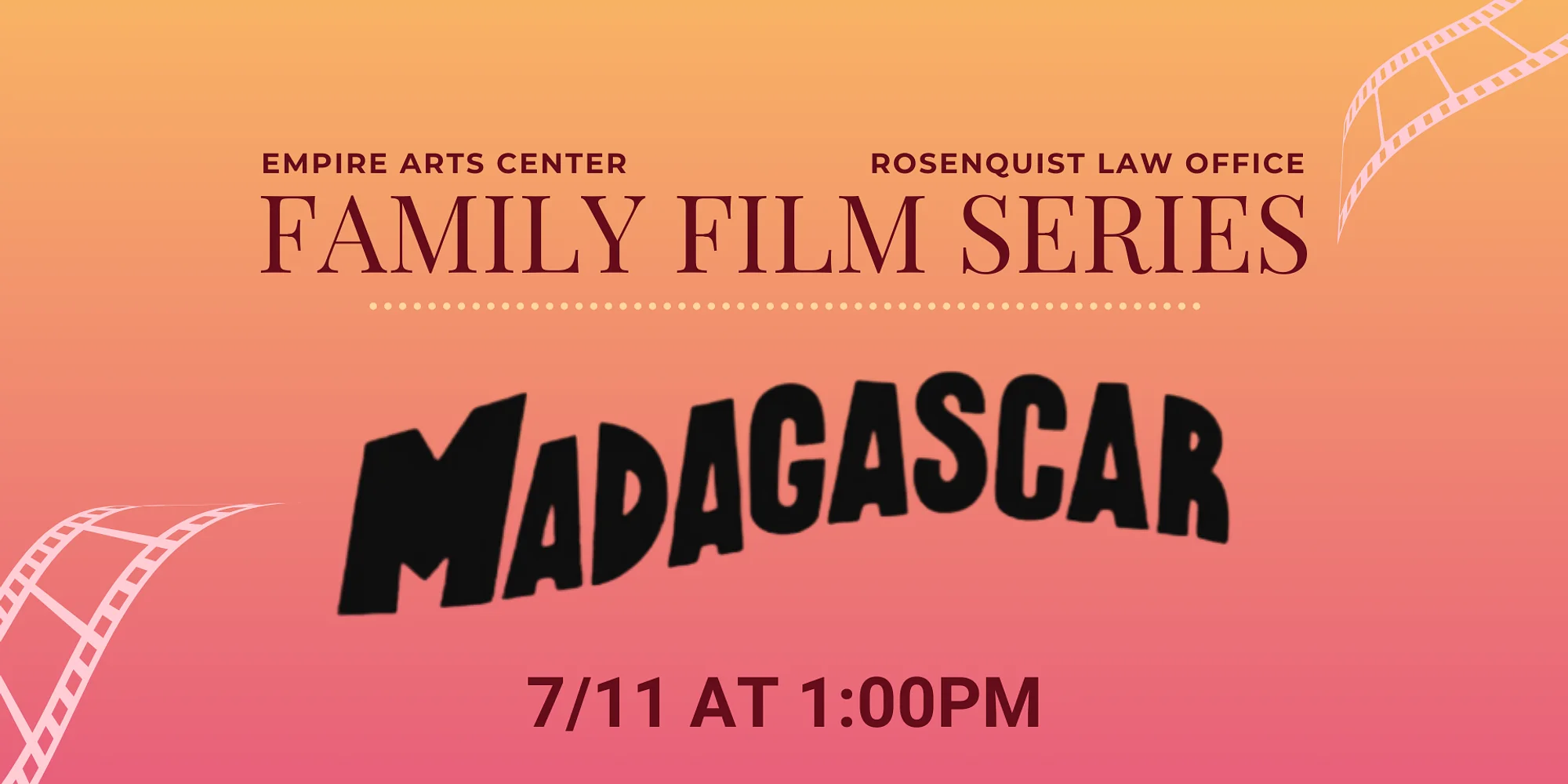 Madagascar (2005) Alex the lion is the king of the urban jungle, the main attraction at New York's Central Park Zoo. He and his best friends -- Marty the zebra, Melman the giraffe and Gloria the hippo -- have spent their whole lives in blissful captivity before an admiring public and with regular meals provided for them. Not content to leave well enough alone, Marty lets his curiosity get the better of him and makes his escape -- with the help of some prodigious penguins -- to explore the world. Part of the Rosenquist Law Family Film Series. Tickets available at the door.