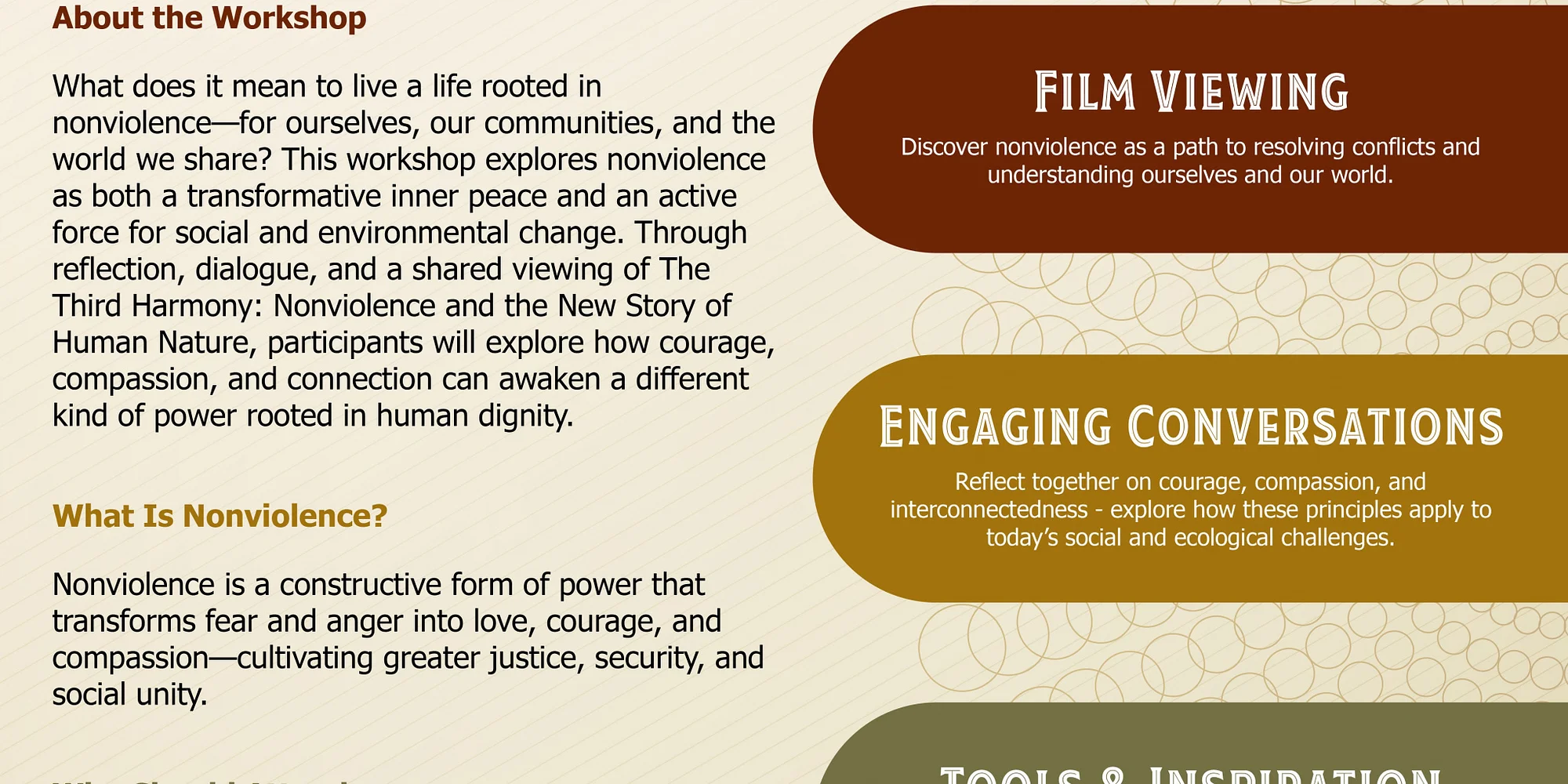 Workshop What does it mean to live a life rooted in nonviolence for ourselves, our communities, and the world we share? This workshop explores nonviolence as both a transformative inner peace and an active force for social and environmental change. Through reflection, dialogue, and a shared viewing of The Third Harmony: Nonviolence and the New Story of Human Nature, participants will explore how courage, compassion, and connection can awaken a different kind of power rooted in human dignity. Nonviolence Nonviolence is a constructive form of power that transforms fear and anger into love, courage, and compassion-cultivating greater justice, security, and social unity. Who Should Attend Open to anyone interested in personal growth, community well-being, social justice, peace building, or environmental action. When: April 11, 2026 (10 am to 3 pm) Includes Lunch Location: Eternal Gandhi Museum Houston 12379 Riceville Road, Houston, TX 77031 Presented by Eternal Gandhi Museum Houston (www.egmh.org) and Meta Center for Nonvolence (www.metacenter.org)