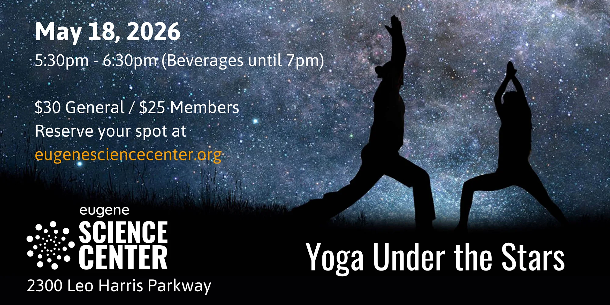 YOGA UNDER THE STARS Where: Eugene Science Center’s Planetarium When: May 18, 2026, 5:30-6:30pm (social time until 7pm) Price: $30 General Admission, $25 Members Spaces are limited to 20 per class. Purchase Tickets Online HERE Breathe, stretch, and center yourself under the stars in our planetarium.
