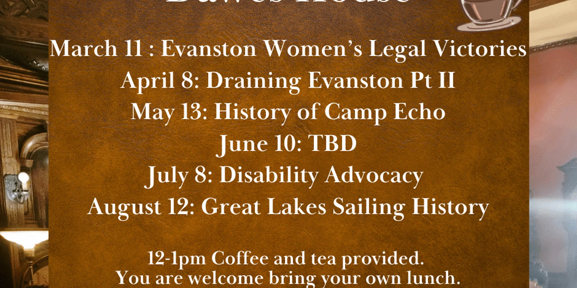 Curiosity Cafe Second Wednesday of the month from 12-1pm at the Evanston History Center, 225 Greenwood St. FREE, no RSVP needed. Come to the Dawes House for coffee, lunch, and informal conversation around a variety of unique Evanston History topics. Feel free to bring a brown bag lunch; coffee and tea will be provided. Upcoming topics: March 11: Evanston Women and the Fragile Nature of Legal Victories with Lori Osborne, former director of the Evanston Women’s History Project April 8: Draining Evanston Part II: 21st Century with Dick Lanyon, former Executive Director of the Metropolitan Water Reclamation District of Greater Chicago May 13: YMCA Camp Echo Through the Decades with Katie Trippi June 10: TBD! July 7: Disability Advocacy in Evanston with Shore Services August 12: The History of Recreational Sailing on the Great Lakes with Madeline Crispell, Curator at the Chicago Maritime Museum