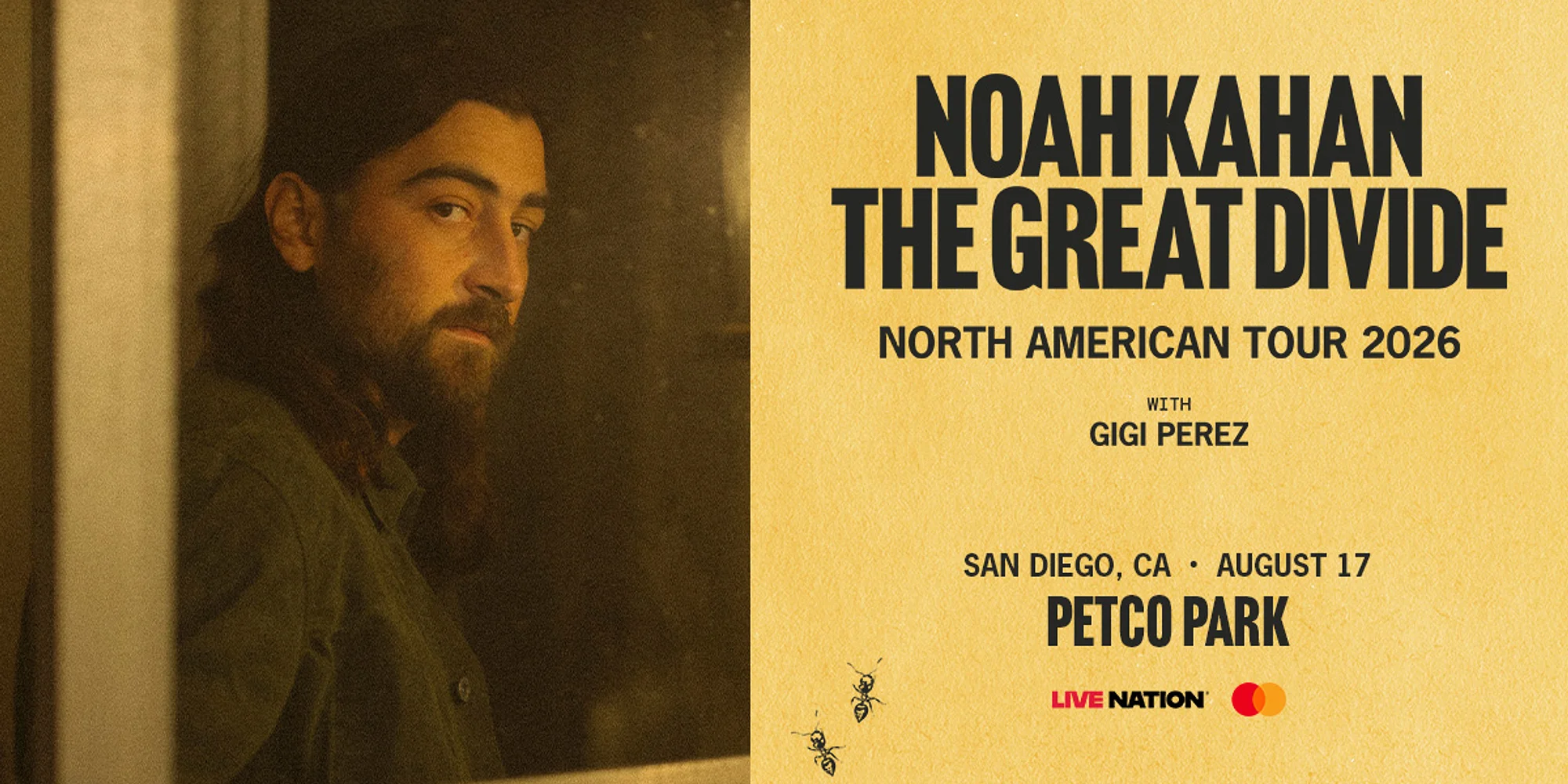 Noah Kahan, with special guest Gigi Perez, is bringing The Great Divide North American Tour 2026 to Petco Park on Monday, August 17! Two-time GRAMMY®-nominated, multi-platinum Vermont singer-songwriter Noah Kahan has risen from his New England roots to become a globally resonant voice of his generation. Across his career, Kahan has amassed nearly 15 billion global streams, sold nearly 12 million global albums, and earned 22 Platinum and Gold certifications. In addition to receiving two GRAMMY® nominations, he’s been recognized by the BRIT Awards, Billboard Music Awards, iHeart Radio Music Awards, People’s Choice Awards, Americana Honors & Awards, and more. Kahan’s critically acclaimed breakthrough 2022 album Stick Season became a cultural phenomenon. Over the span of two years, the 4x Platinum album and its 8x Platinum title track reached number one across North America, the UK, and Europe, becoming the fourth best-selling album of 2024 and remaining in the Top 15 more than three years after its release. In 2023 following the release of Stick Season, Kahan launched his mental health non-profit, The Busyhead Project, which has raised over $5.5 million to date in support of its mission to increase awareness around the importance of mental health. Now, Kahan enters his next artistic era with The Great Divide, his fourth studio album, due April 24th via Mercury Records. Written in the wake of his rapid rise to global fame, the album finds Kahan at his most honest, reflective, and emotionally resonant—grappling with success, identity, family, distance, and the unspoken truths that separate people from one another. Produced by acclaimed producer and Stick Season collaborator Gabe Simon (Dua Lipa, Lana Del Rey, Koe Wetzel) alongside GRAMMY®-winning producer Aaron Dessner (Taylor Swift, Bon Iver), The Great Divide builds on Kahan’s signature storytelling while pushing his sound into more expansive, anthemic, and sonically adventurous territory. In support of the new album, Kahan will embark on The Great Divide Tour this summer, headlining stadiums across North America for his biggest tour to date. At the heart of Noah Kahan’s music remains the same guiding purpose that first drew fans in: honest storytelling, shared vulnerability, and songs that help listeners feel understood.