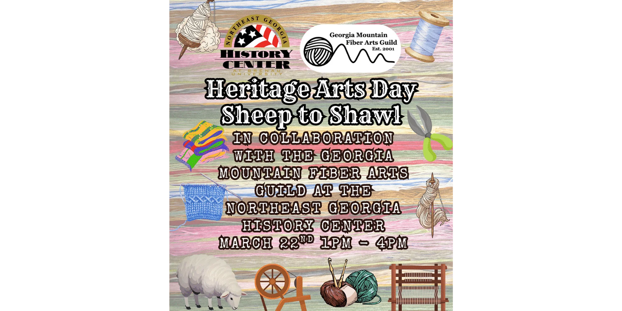 The History Center will be open on Sunday, March 22nd, 2026 from 1pm to 4pm for Heritage Arts Day: Sheep to Shawl! This is a collaboration with the Georgia Mountain Fiber Arts Guild. No Pre-Registration Required: General Admission – $8 Adults, $7 Seniors/Military, $6 Students, and Free for our Members. There will be a wooly friend (sheep) for visitors to meet and learn about the shearing process, as well as drop spindles, frame looms, and a carding station with wool available for guests to try. The Guild Members will have their spinning wheels to demonstrate yarn-making, and will be happy to answer questions about their craft. And of course, the History Center will be fully open for visitors to tour during the event hours.
