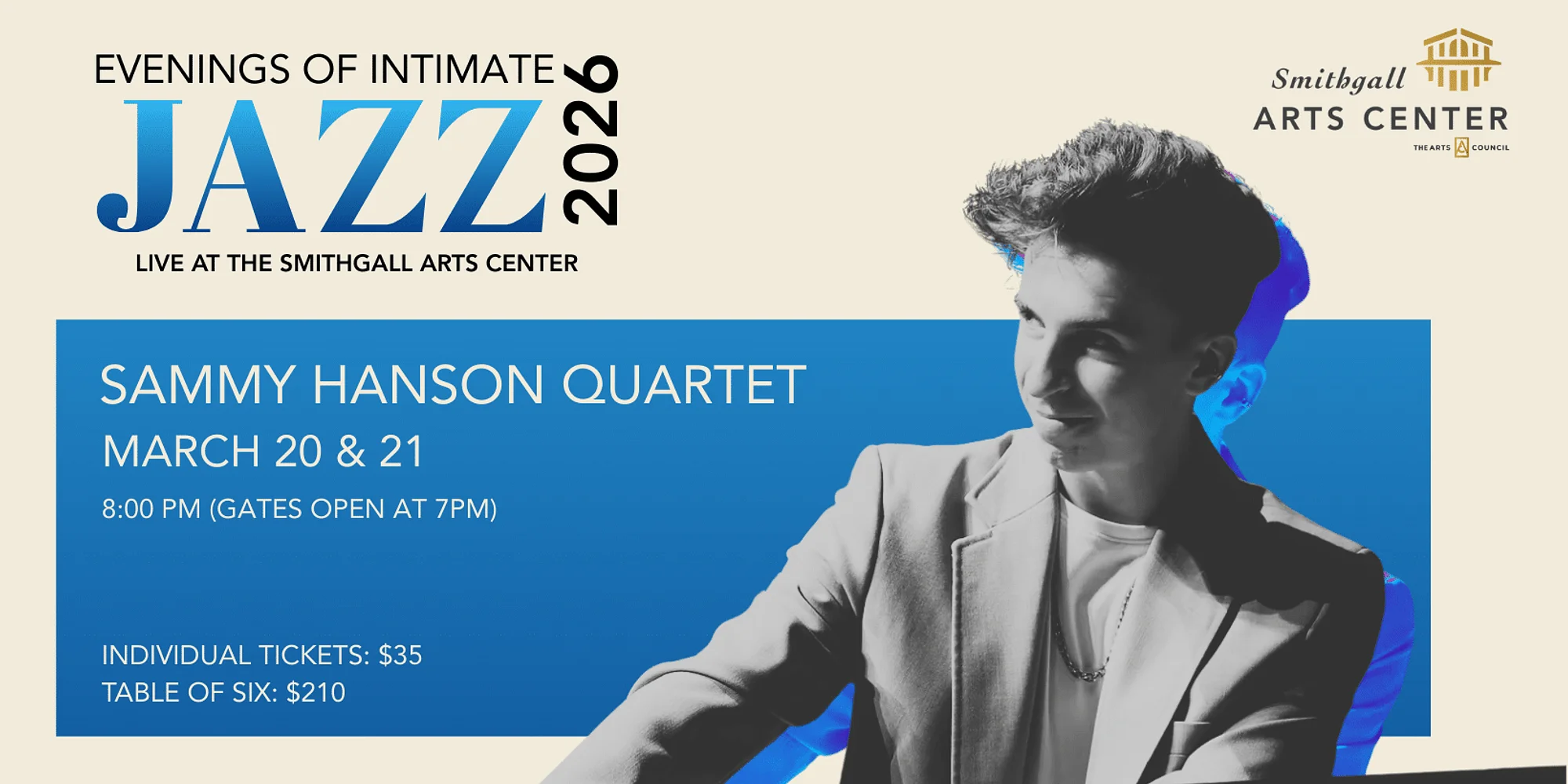 Sammy Hanson is considered by most to be the most promising young jazz pianist in the Atlanta area, and a dynamic musician whose artistry shines through in every improvised note. With a Bachelor’s degree in Jazz Performance from Florida State University, he brings over 18 years of musical experience to the stage—garnering acclaim in prestigious competitions like the Savannah Swing Central Jazz Festival, Essentially Ellington at Lincoln Center, and the Jack Rudin Jazz Championship, and enchanting audiences at Carnegie Hall and even the U.S. Embassy in Costa Rica. Now based in Atlanta, The Sammy Hanson Quartet just released his 2025 debut album, which captures the spontaneity and emotion of live performance—each track a fresh, unforgettable moment of musical discovery. Seating is first come, first serve. Gates open at 7:00pm, concert starts at 8:00pm.