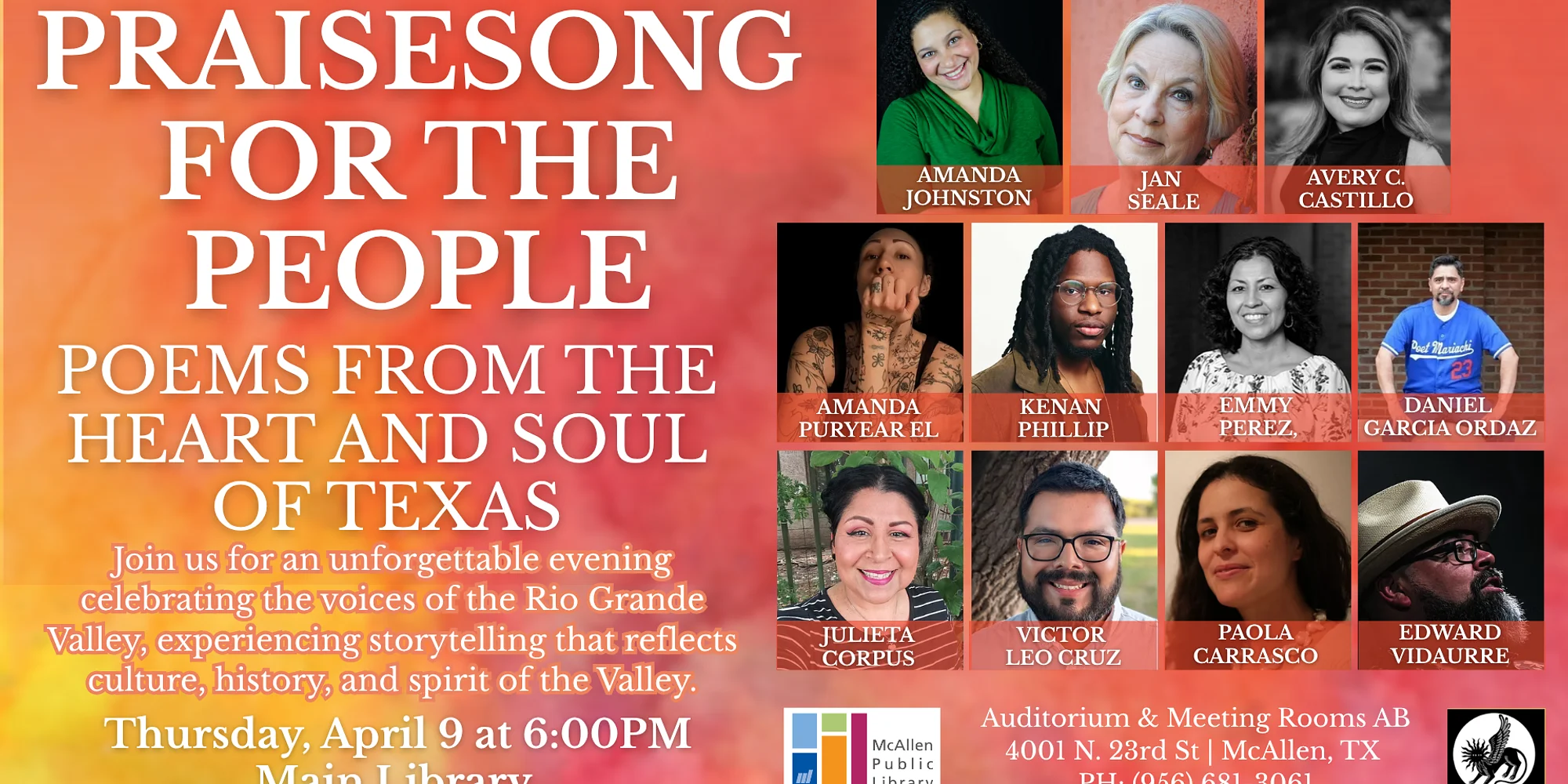 A book presentation at McAllen Public Library of “Praisesong for the People: Poems from the Heart & Soul of Texas.” Join us for an unforgettable evening celebrating voices of the Rio Grande Valley, experiencing the storytelling that reflects the culture, history, and spirit of the Valley. Featuring Amanda Johnston, Jan Seale, Avery C. Castillo, Amanda Puryear El, Kenan Phillip, Emmy Perez, Daniel Garcia Ordaz, Julieta Corpus, Victor Leo Cruz, Paola Carrasco, and Edward Vidaurre.