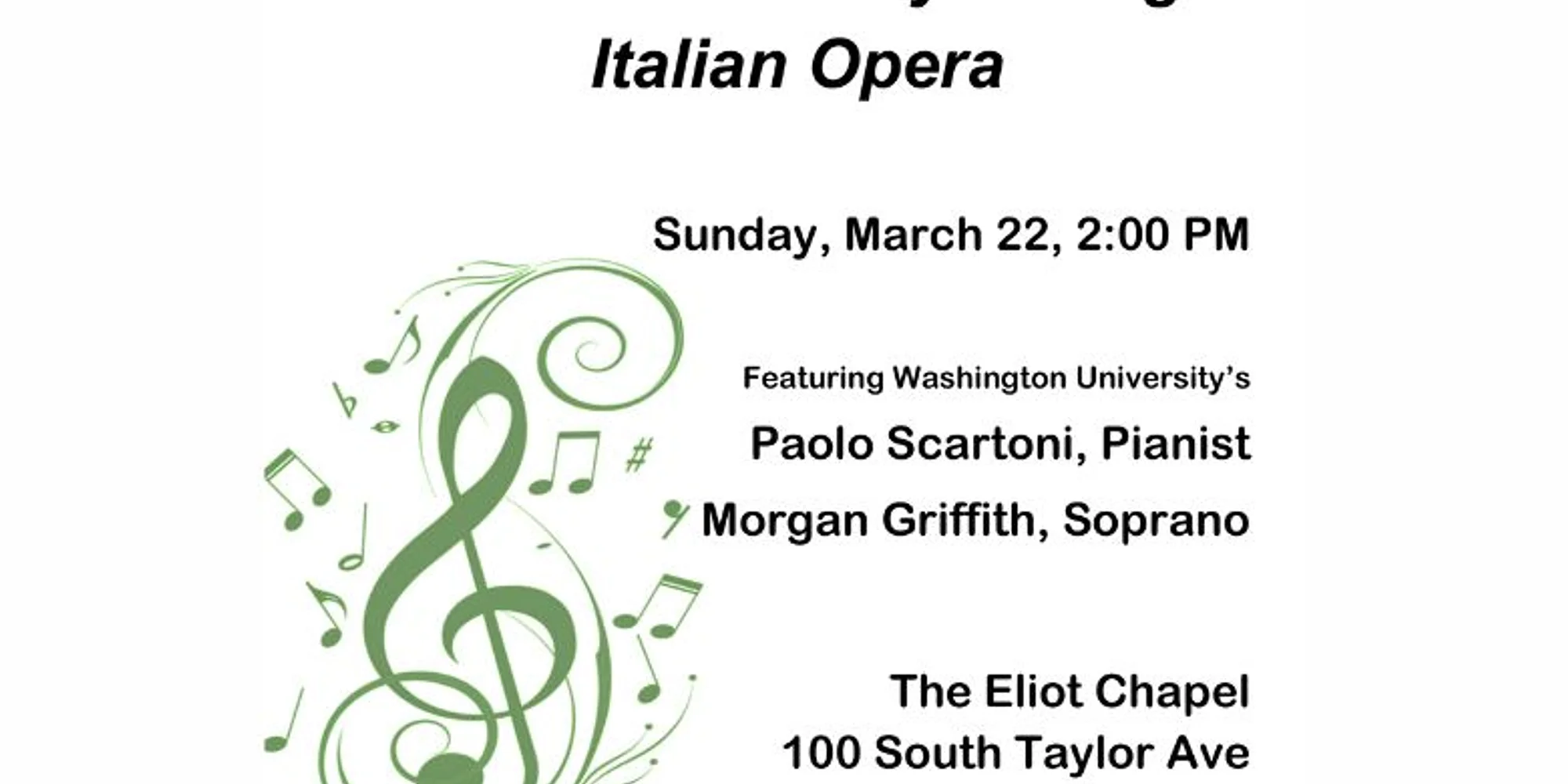 Please join for A Musical Journey through Italian Opera featuring Washington University's Paolo Scartoni, Pianist and Morgan Griffith, Soprano.
