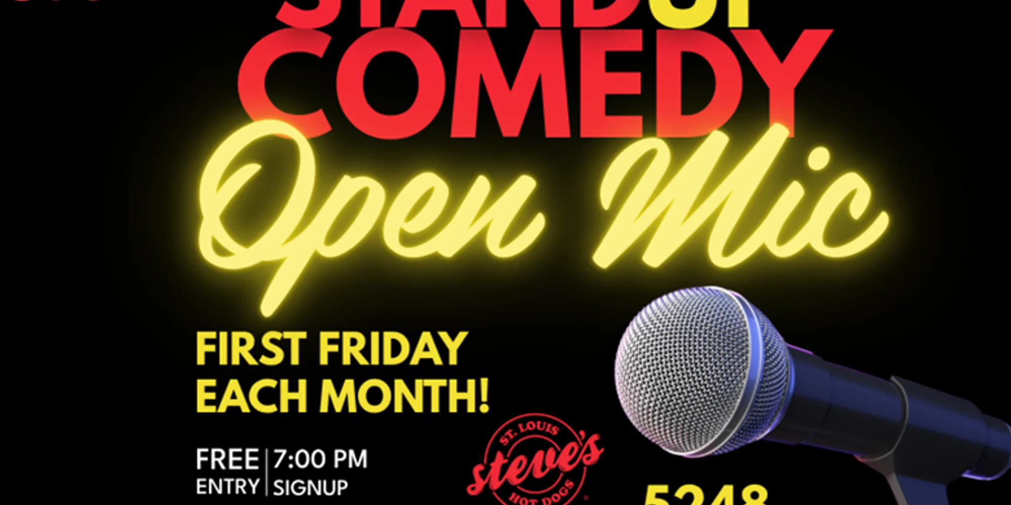 Every first Friday of the month, Steve's Hot Dogs on Delmar extends it's hours for Open Mic Comedy! Come out for an evening of stand-up, hot dogs, and drinks in the heart of the Delmar Maker Locale. Whether you’re testing jokes or just ready to laugh, it’s the perfect way to wrap up the weekend. Sign up begins at 7 pm and the show starts at 7:30pm! Atmosphere: Delmar’s Maker Locale is buzzing with creativity and community. The crowd is lively, supportive, and ready to have fun - a mix of locals, makers, and neighbors who bring big energy to every show. It’s the kind of setting where comedy feels electric, and Fridays feel like an event.