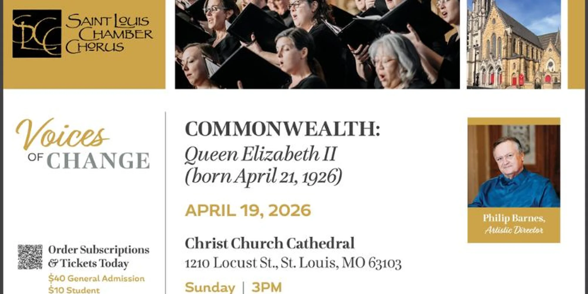 Presented by the Saint Louis Chamber Chorus. In a secular salute to the new monarch of Great Britain, ten poets and ten composers were invited to create a suite of modern madrigals, modeled after the collection for Elizabeth I that was published in 1601. The resulting tribute was titled “A Garland for the Queen,” and first performed on the eve of the Coronation in 1953. Although individual movements have been sung in St. Louis before now, never before has the complete suite been presented in St. Louis. However, in recognition of Elizabeth’s 100th birthday (she was born 21st April 1926), the Chamber Chorus performs all ten madrigals, complemented by similar tributes by William Byrd, Vaughan Williams and the Nigerian composer, Vincent Chinemelu. A highlight of this concert will be a new commission from a British woman composer, Sasha Johnson Manning, that sets Psalm 90, one of whose verses, “thou art come to three score years and ten,” is particularly appropriate as the Chamber Chorus is currently celebrating its seventieth season, matching Elizabeth II’s reign of seven decades. Johnson Manning is flying here from England for the premiere, and concertgoers will be able to meet and greet the composer at the performance on Sunday, 19th April at 3 pm in that most English of St. Louis churches, Christ Church Cathedral downtown, at 1210 Locust St., Saint Louis, MO 63103