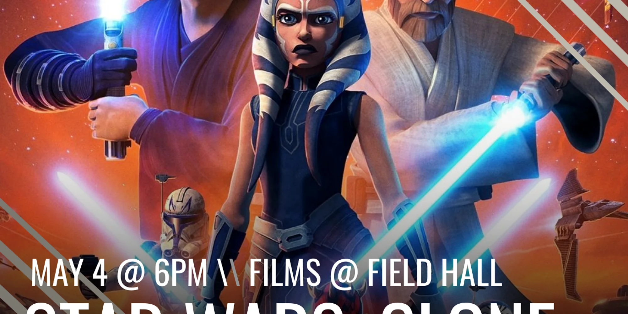 Field Hall & Anime Kat Present: Films @ Field Hall: Star Wars: The Clone Wars Monday, May 4th @ 6:00PM | Donna M. Morris Theater *Pay-what-makes-you-happy! | RSVPs Requested *$10-$15 suggested donation – RSVPs for Films @ Field Hall are preferred, guests will be asked to register at the door. May the 4th be with you! Celebrate Star Wars day with a special screening of Star Wars: The Clone Wars. Dress up in your best Star Wars costume and enjoy themed drink and food specials in the Sunset Lounge before the show! The galaxy teeters on the brink as the Clone Wars rage across star systems. Jedi Knights Anakin Skywalker and Obi-Wan Kenobi fight alongside their clone battalions to hold back the Separatist army, while Ahsoka Tano steps into her own as Anakin’s new Padawan. With battles, betrayals, and a threat rising in the shadows, the fate of the Republic hangs in the balance. Star Wars: The Clone Wars (2008) is rated PG for sci-fi action and has a runtime of 1 hour and 38 minutes. Field Arts & Events Hall does not generally provide advisories about subject matter or potentially triggering content in films, as sensitivities vary from person to person. In addition to the synopses, trailers and other links on our website, further information about content and age-appropriateness for specific films can be found on Common Sense Media, IMDb and DoesTheDogDie.com as well as through general internet searches.