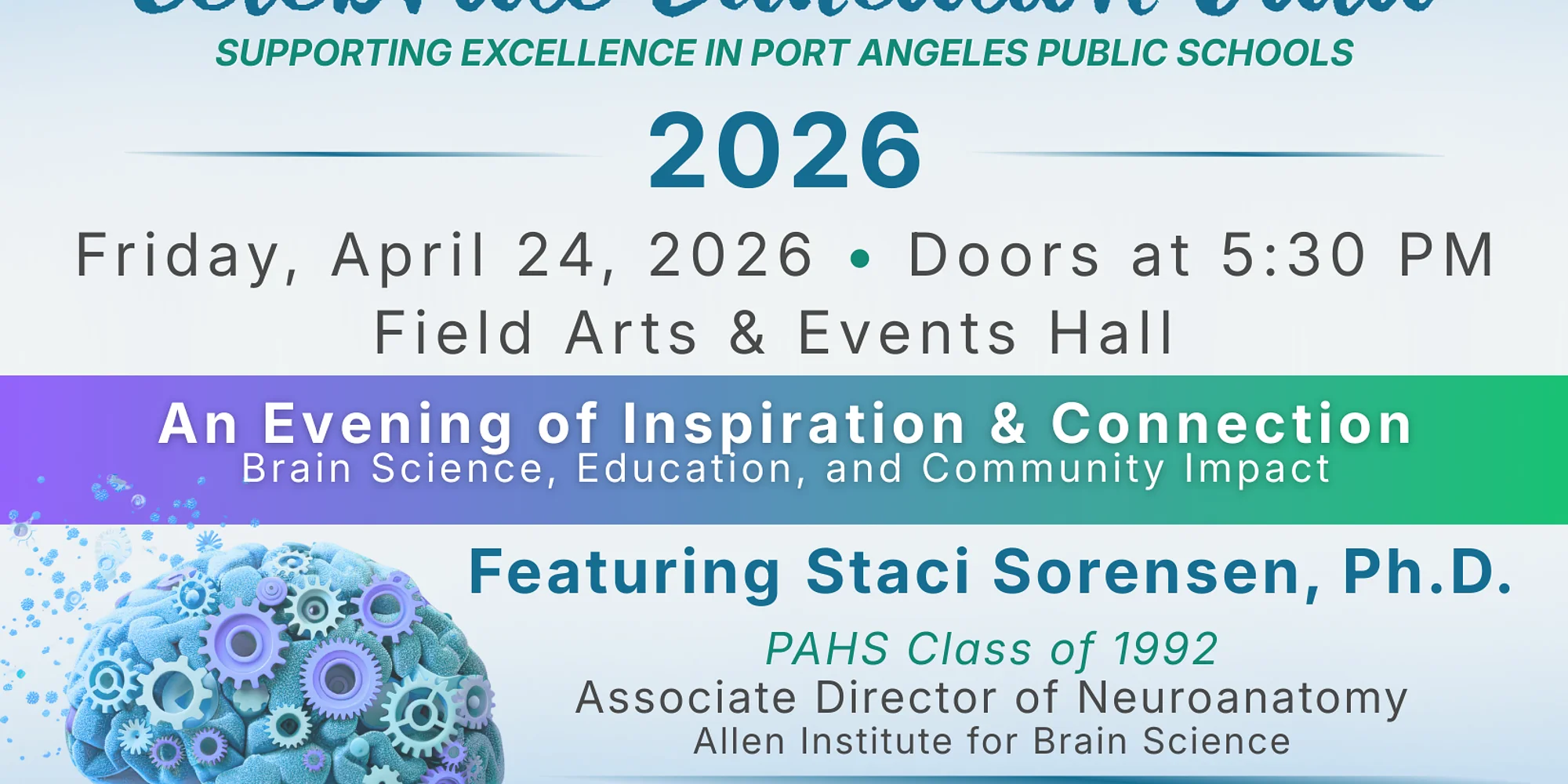 Port Angeles Education Foundation Presents: Celebrate Education Gala Friday, April 24th | 1PM-9PM | Field Arts & Events Hall Join us for An Evening of Inspiration & Connection: Brain Science, Education, and Community Impact, PAEF’s annual fundraiser celebrating the people and programs that make a difference in Port Angeles public schools and the community. Your support helps fund PAEF initiatives such as scholarships, school and teacher grants, student needs, and meaningful partnerships with local nonprofits—ensuring students and educators have the resources they need to thrive.