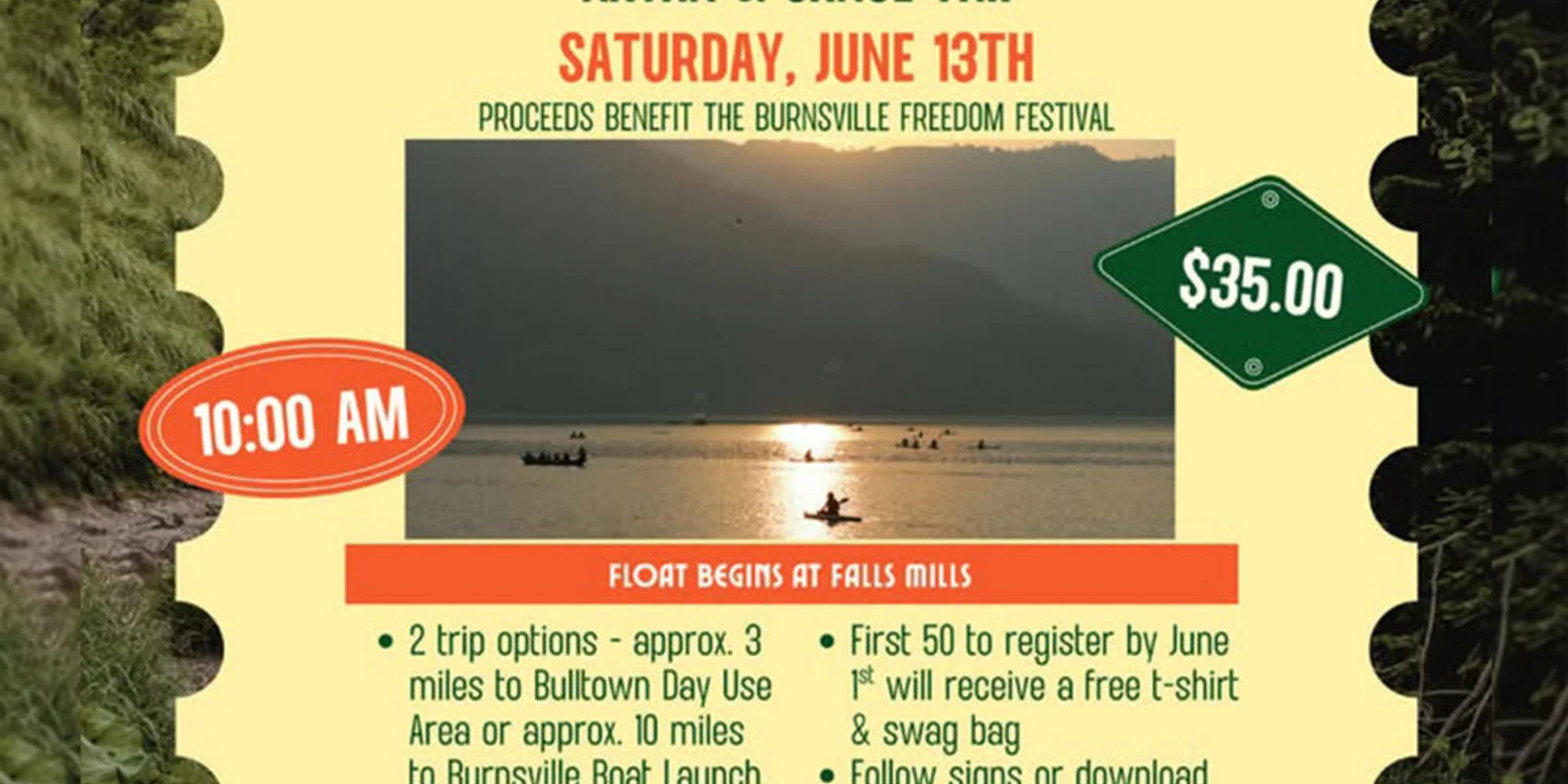 Join the Burnsville Freedom Fest for a relaxing and fun kayak float and help to fund this years Freedom Fest! Bring your kayak or canoe and enjoy a scenic float with friends on the Burnsville Lake! FREE T-SHIRT for the first 50 people to register by June 1st. You choose your size and color ( white or gray) Don’t miss your chance to float and rep the festival in style Register now: call (304) 853-2605