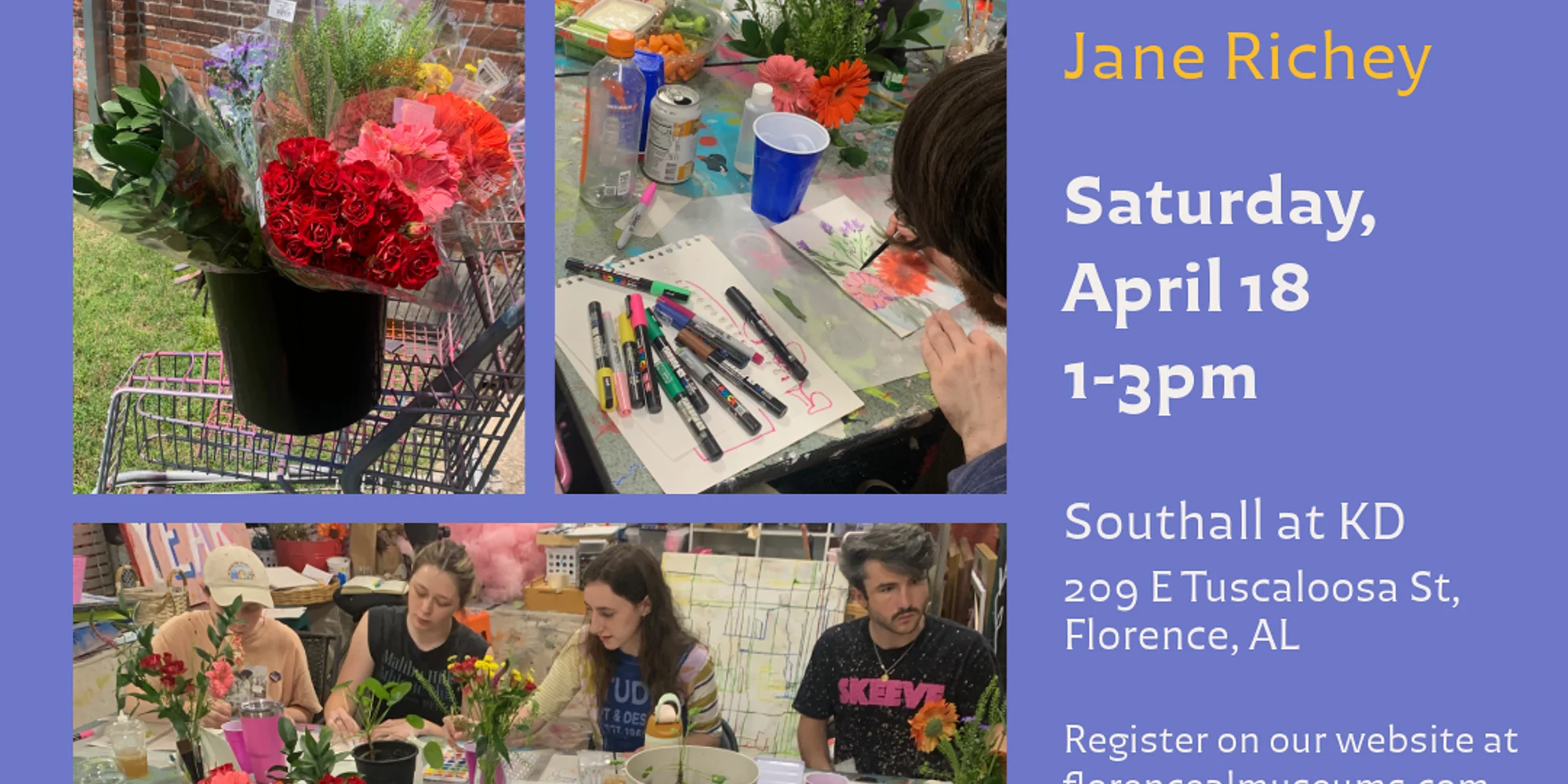 Watercolor Workshop: Build Your Own Bouquet Let's celebrate Spring! Join us on Saturday, April 18th from 1pm-3pm for a watercolor workshop led by Liza Jane Richey. In this beginner-friendly watercolor workshop, you’ll begin by building your own fresh flower bouquet to be your subject. We will practice a few drawing exercises to get our observation skills ready, and finish by creating an original watercolor painting! You will leave this workshop with a mini-bouquet, an original watercolor painting, new skills and new friends! Registration for this event is $20 and can be found below. Liza Jane Richey is a multi-medium folk artist and educator based in Huntsville, Alabama. Her work has recently been on view at The Curated Gallery in Huntsville, Uproar Public Art Festival in North Carolina, 7 Points Art Crawl in Florence, and at Lowe Mill Arts & Entertainment in Huntsville. She hosts community workshops that invite people to slow down, connect, and make something beautiful. The Kennedy-Douglass Center for the Arts is located at 217 E Tuscaloosa Street, Florence, AL, and is open Monday - Friday from 9:00 a.m. to 4:00 p.m. and Sundays from 1:00 p.m. - 4:00 p.m. The event will be held at Southall House, just next to the Art Center office, at 209 E. Tuscaloosa St. Call 256-760-6379 for more information. Watercolor Workshop: Build Your Own Bouquet $20.00 Watercolor Workshop: Build Your Own Bouquet Let's celebrate Spring! Join us on April 18th from 1pm-3pm for a watercolor workshop led by Liza Jane Richey. In this beginner-friendly watercolor workshop, you’ll begin by building your own fresh flower bouquet to be your subject. We will practice a few drawing exercises to get our observation skills ready, and finish by creating an original watercolor painting! You will leave this workshop with a mini-bouquet, an original watercolor painting, new skills and new friends! Liza Jane Richey is a multi-medium folk artist and educator based in Huntsville, Alabama. Her work has recently been on view at The Curated Gallery in Huntsville, Uproar Public Art Festival in North Carolina, 7 Points Art Crawl in Florence, and at Lowe Mill Arts & Entertainment in Huntsville. She hosts community workshops that invite people to slow down, connect, and make something beautiful. The Kennedy-Douglass Center for the Arts is located at 217 E Tuscaloosa Street, Florence, AL, and is open Monday - Friday from 9:00 a.m. to 4:00 p.m. and Sundays from 1:00 p.m. - 4:00 p.m. The event will be held at Southall House, just next to the Art Center office, at 209 E. Tuscaloosa St. Call 256-760-6379 for more information. Purchase