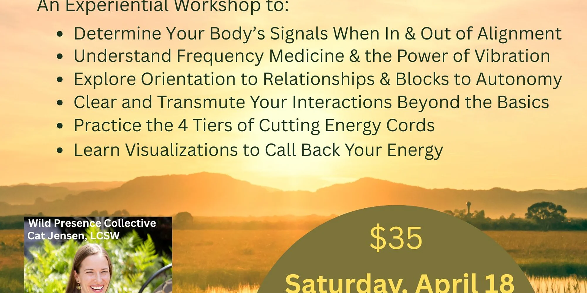 Join Cat Jensen, LCSW, in this experimental workshop, Using Sound Healing, Somatic Practices & the Elements to Embody Your energy signature & find true authenticity and belonging in relationships. A workshop to: Determine your body's signals when in & out of alignment, Understanding frequency medicine & the power of vibration, explore orientation to relationships & blocks to autonomy, clear & transmute your interactions beyond the basics, practice the 4 tiers of cutting energy cords & learn visualizations to call back your energy. REGISTER HERE: https://SBFlowYoga.as.me/?appointmentType=90802503