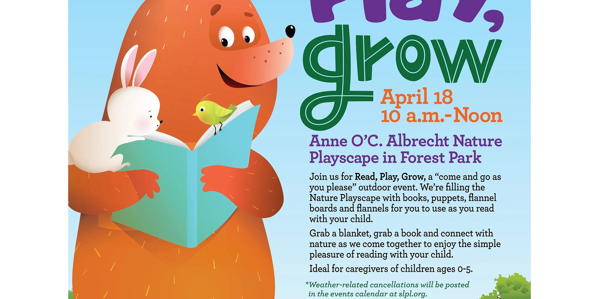 Read, Play, Grow in the Nature Playscape Date: April 18 Time: 10 a.m.–12 p.m. Cost: Free Location: Anne O’C. Albrecht Nature Playscape (map below) Parking: Free parking is available on streets and in lots near the World’s Fair Pavilion. Biking: Bike racks are located at two entrances (map below). Transit: The MetroBus 90 Hampton route has northbound and southbound stops nearby at Concourse at Washington. Join us for Read, Play, Grow, a “come and go as you please” outdoor event in Forest Park. We’ll fill the Nature Playscape with books, puppets, flannel boards and flannels. Grab a blanket, grab a book and connect with nature as we come together to enjoy the simple pleasure of reading with your child. Ideal for caregivers of children ages 0-5. Weather: This program is weather dependent. Cancellations will be posted in the event calendar on the St. Louis Public Library’s website. Sensory considerations: Potential for close proximity/shared space with other participants Some bright colors and loud noises. For accessibility accommodations, please call 314-241-2288.