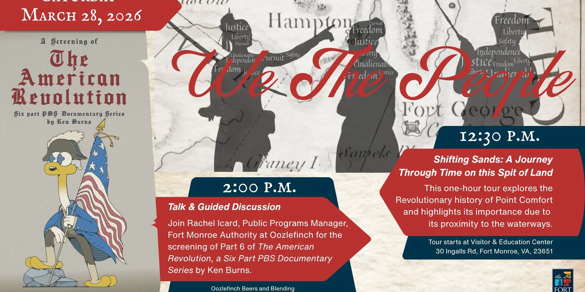 Join us for a partner program with Oozlefinch Beers and Blending for Virginia 250! Start inside the Visitor Center at 12:30pm with our “Shifting Sands” tour to learn more about Fort Monroe during the American Revolution. Then head over to Oozlefinch at 2:00pm for a guided discussion and showing of Part 6 of “The American Revolution”, a PBS Documentary Series by Ken Burns. We are excited to partner with the Hampton Convention & Visitors Bureau to present the six-part PBS Ken Burns documentary series, “The American Revolution.” The Barrel Room at Oozlefinch will be hosting this bi-weekly screening one Thursday and one Saturday every month from January through June, and all day on the 4th of July. Seating is limited! Claim your FREE EventBrite ticket to secure a seat. SCREENING SCHEDULE: Part 6 – Saturday, March 28th (2-4pm) Part 1 – Thursday, April 9th (5-7pm) Part 2 – Saturday, April 25th (2-4pm) Part 3 – Thursday, May 14th (5-7pm) Part 4 – Saturday, May 30th (2-4pm) Part 5 – Thursday, June 11th (5-7pm) Part 6 – Saturday, June 27th (2-4pm) Full 6-Part Series – Saturday, July 4th (12pm-12am) Beer will be available to purchase from the main Taproom for those 21+, and rotating food trucks will be on site. Questions? Email us at info@oozlefinchbeers.com