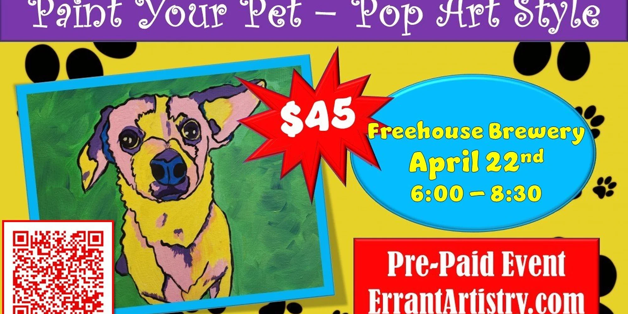 This is a 2.5-Hour painting class that is led in a step-by-step manner to ensure all levels of artists leave with a masterpiece. All materials are provided for you, including a large 16x20 pre-drawn canvas of your very own pet! Your responsibilities are as follows: Take a clear, close up picture of your pet. Include chest and shoulders. Please remove collar or it will be included in your sketch. Send Picture to Andrea via EMAIL at: ErrantArtistry@gmail.com , include your full name and date of event so your picture is assigned to the correct event. Pictures must be sent in no later than April 21st. One pet per picture. If no picture is received, no picture will be drawn and you will not be able to participate in the class. No Refunds due to lack of responsibilities on your part. Ticket Info: Each seat $45.00 https://www.errantartistry.com/.../freehouse-brewery... Terms & Conditions: *Beverages, Food etc. is sold separately from Errant Artistry* *Errant Artistry requires a minimum of 10 participating painters for the event to continue. If there is not enough to hold the class, the class will be cancelled and the customers will be notified and a refund will be issued. *No refunds or credit to another class will be issued if not notified at least 48 hours prior to date of class, no exceptions. *If you have any questions, please contact Andrea directly at 864-504-9957