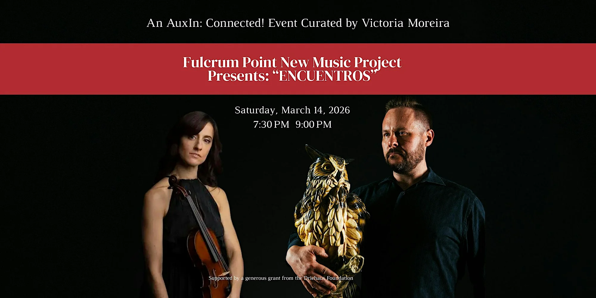 Fulton Street Collective in collaboration with Fulcrum Point New Music Project presents ENCUENTROS on Saturday March 14th at 7:30pm “ENCUENTROS” An AuxIn: Connected! Event Curated by Victoria Moreira Orlando Pimentel, clarinet Victoria Moreira, violin Doyle Armbrust, viola Elena Abend, Piano This concert explores the shared emotional language of humanity as expressed through the rich and complex heritage of Latin America. Shaped by the meeting of three continents, Europe, Africa and the Indigenous Americas, the music reflects a cultural dialogue, tension and fusion. The pieces selected for this program speak from both a distinct cultural identity and to something universally human. In these sounds, we hear longing, joy, resilience and memory, emotions that belong to no single place, yet find a powerful voice in Latin America’s unique artistic inheritance. The AuxIn: Connected! concert series is supported by a generous grant from the Driehaus Foundation. 7pm Doors 7:30 Show $15 Suggested Donation FREE PARKING