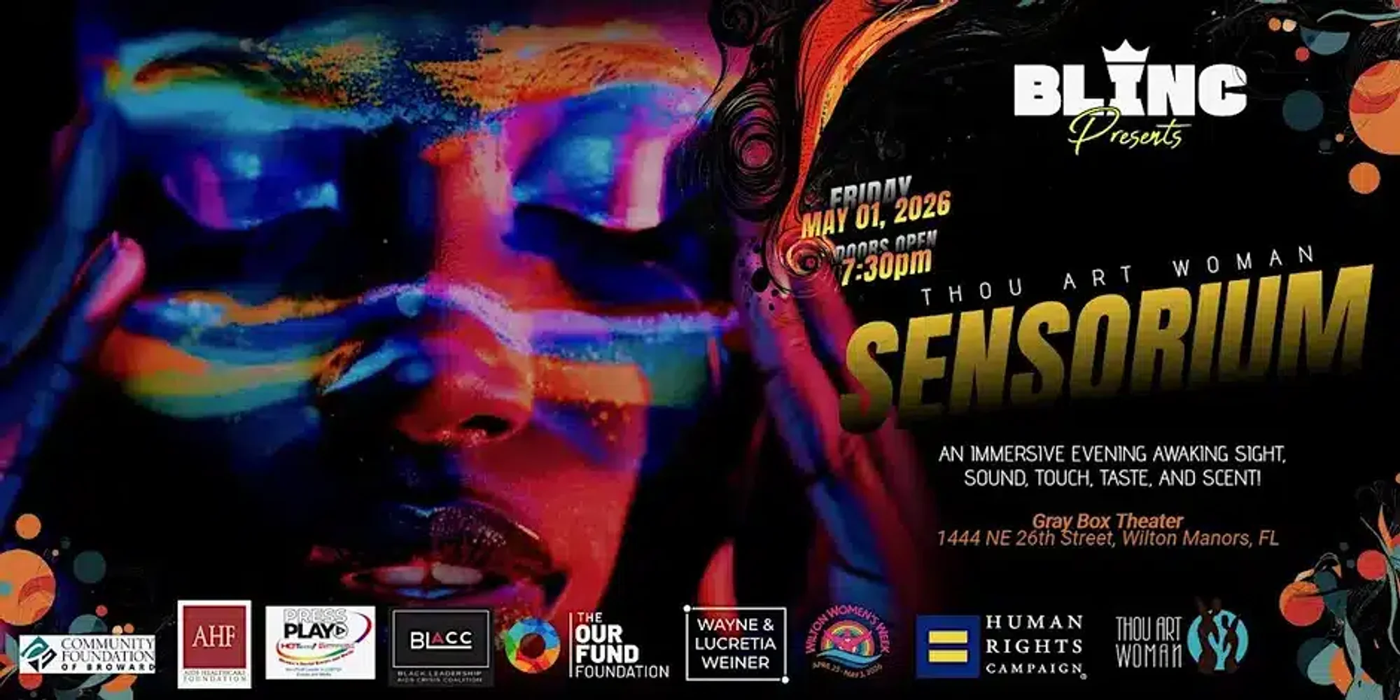 Immersive five-senses experience blending live performance, art, food & vibe in an intimate, unapologetically queer atmosphere. Thou Art Woman: Sensorium ✨🔥 An immersive evening designed to awaken your senses and invite indulgence. This is not a show you simply attend — it’s an experience you enter. A sensual, art-forward, unapologetically queer journey that engages sight, sound, touch, taste, and scent to create something you feel in your body — not just watch with your eyes. 💃🏽🎶🌹🍷 From the moment you step into the room, every detail is intentional. The lighting glows differently. The music moves through you. The air carries curated fragrance. Performers don’t just take the stage — they transform the space. ✨ Live dancers & featured performers ✨ Immersive, five-senses design ✨ Complimentary food included with entry ✨ Cash bar ✨ Curated vendors ✨ Intimate, elevated, affirming atmosphere Expect artistry. Expect energy. Expect a room alive with presence, pleasure, and connection. This is not passive entertainment. This is embodied experience. Come open. Come curious. Come ready to feel. 💫 Indulge your senses. Surrender to the experience. Thou Art Woman: Sensorium. Tickets are limited so don’t miss your change to be a part of this incredible event. Please note, venues and talent are subject to change. No refunds will be issued for any such reasons. Thank you for your support! Where: Grey Box Theater 1444 NE 2dn Street Wilton Manors, FL When: Friday, May 1, 2026 at 7:30pm Cost: $28.52 Tickets: Tickets prices vary. CLICK HERE to purchase with BLINC