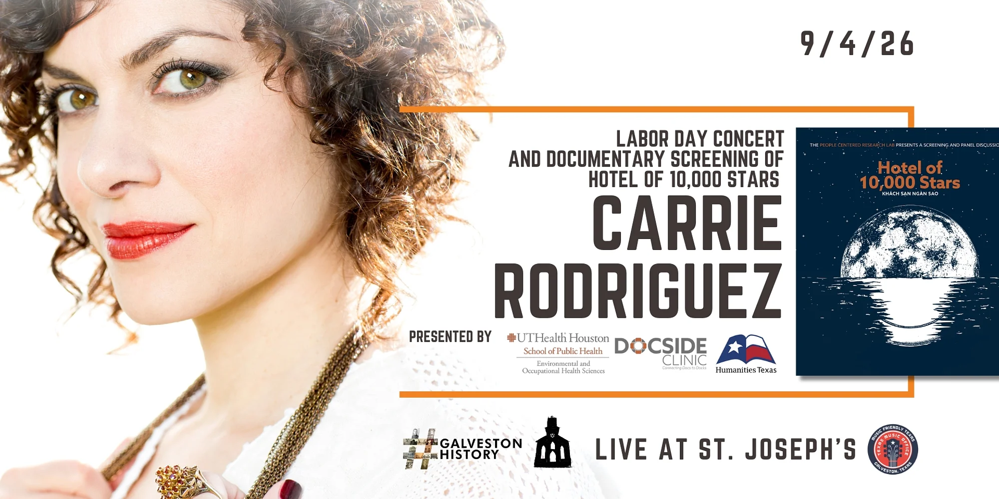 Presented by UTHealth Houston School of Public Health, Docside Clinic: Connecting Docs to Docks, and Humanities Texas ABOUT HOTEL OF 10,000 STARS Hotel of 10,000 Stars is a short documentary that highlights the people who are tasked with doing the difficult and dangerous work of putting food on our tables. It serves as a window into the supply chain and a complex web of systems that make up this industry, allowing viewers to peek into the lives of the people whose livelihoods and health are forever intertwined with it. Learn more at centerforpeople.com. ABOUT CARRIE RODRIGUEZ Carrie Rodriguez, a composer, violinist, and singer from Austin, Texas, finds beauty in the cross-pollination of diverse traditions. She melds fiery fiddle playing, electrifying vocals, and a fresh interpretation of new and classic songs with an “Ameri-Chicana” attitude. Carrie began playing the violin at age 5; by age 10, she had performed as part of a group at Carnegie Hall, and she continued on the classical track in her first year at Oberlin Conservatory. She then shifted gears to pursue her love affair with the fiddle—staying true to her Texas roots—at the Berklee College of Music. As a singer-songwriter, she has released 5 solo studio albums, 3 duet albums with the legendary Chip Taylor (author of “Wild Thing” and “Angel of the Morning”), and 2 live albums. Her last full-length solo recording, the bilingual Lola, was heralded as “the perfect bicultural album” and was included in NPR’s Best Albums of 2016, as well as Rolling Stone’s Best Country Albums of the Year. Carrie has performed on stages across North America and Europe, as well as on programs such as PBS’s Austin City Limits, The Tonight Show, and NPR’s Tiny Desk Concerts. In 2017, Carrie founded a highly acclaimed ongoing concert series at the Paramount State Theatre in Austin, Texas, called Laboratorio; a celebration and exploration of Latine culture. Her most recent work has been as a composer and lyricist for an original musical, ¡Americano!, which chronicles the true story of an inspiring DREAMer named Tony Valdovinos. The musical enjoyed a successful 6-week run off-Broadway at New York City’s New World Stages in June 2022, and also earned Rodriguez a nomination for a 2022 Drama Desk Award for Outstanding Music. Carrie lives in Austin with her husband and frequent musical collaborator, Luke Jacobs, and their 9-year-old son, Cruz.