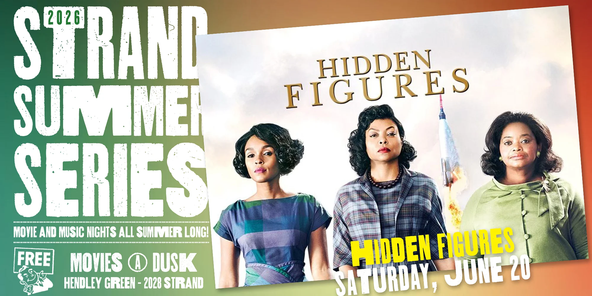 Galveston Historical Foundation invites you to enjoy historic downtown Galveston for the 2026 Strand Summer Series! These movie nights are held at Hendley Green and feature free films from April through September. ABOUT HIDDEN FIGURES | Hidden Figures is a biographical drama that tells the true story of three brilliant African-American women—Katherine Johnson, Dorothy Vaughan, and Mary Jackson—working at NASA as “human computers” during the 1960s Space Race. Despite facing intense racism and sexism, they play a crucial role in calculating the launch of astronaut John Glenn into orbit.