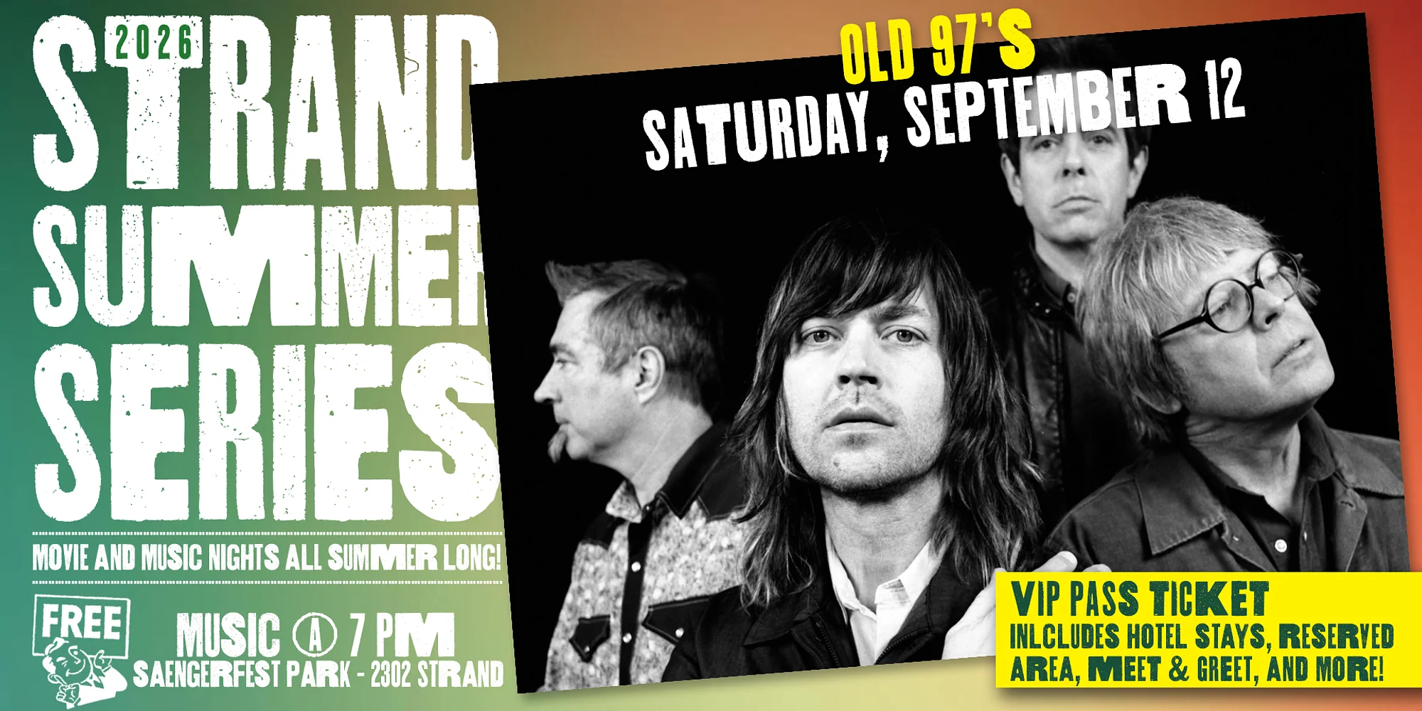 Galveston Historical Foundation invites you to enjoy historic downtown Galveston for the 2026 Strand Summer Series! These movie and music nights are located in The Strand’s principal parks and feature free-to-the-public concerts and movies from April through September. Performances are free to the public with on-site beer and wine, select vendors, and a reserved VIP area with reserved seating, complimentary drinks, meet and greets, and more. ABOUT OLD 97’S | Old 97’s are a pioneering alt-country band whose smart, literate songwriting and high-octane live shows helped define the genre’s rise in the 1990s. Formed in Dallas, the band—led by charismatic frontman Rhett Miller—blends rootsy country, punk energy, and power-pop melodies into songs that balance wit, romance, and emotional candor. Breakthrough albums like Too Far to Care and Fight Songs established their reputation for sharp storytelling and melodic punch, while later releases continued to evolve their sound without losing urgency or heart. Renowned for their relentless touring and electric stage presence, Old 97’s remain one of the most enduring and influential bands to emerge from the American roots-rock movement.