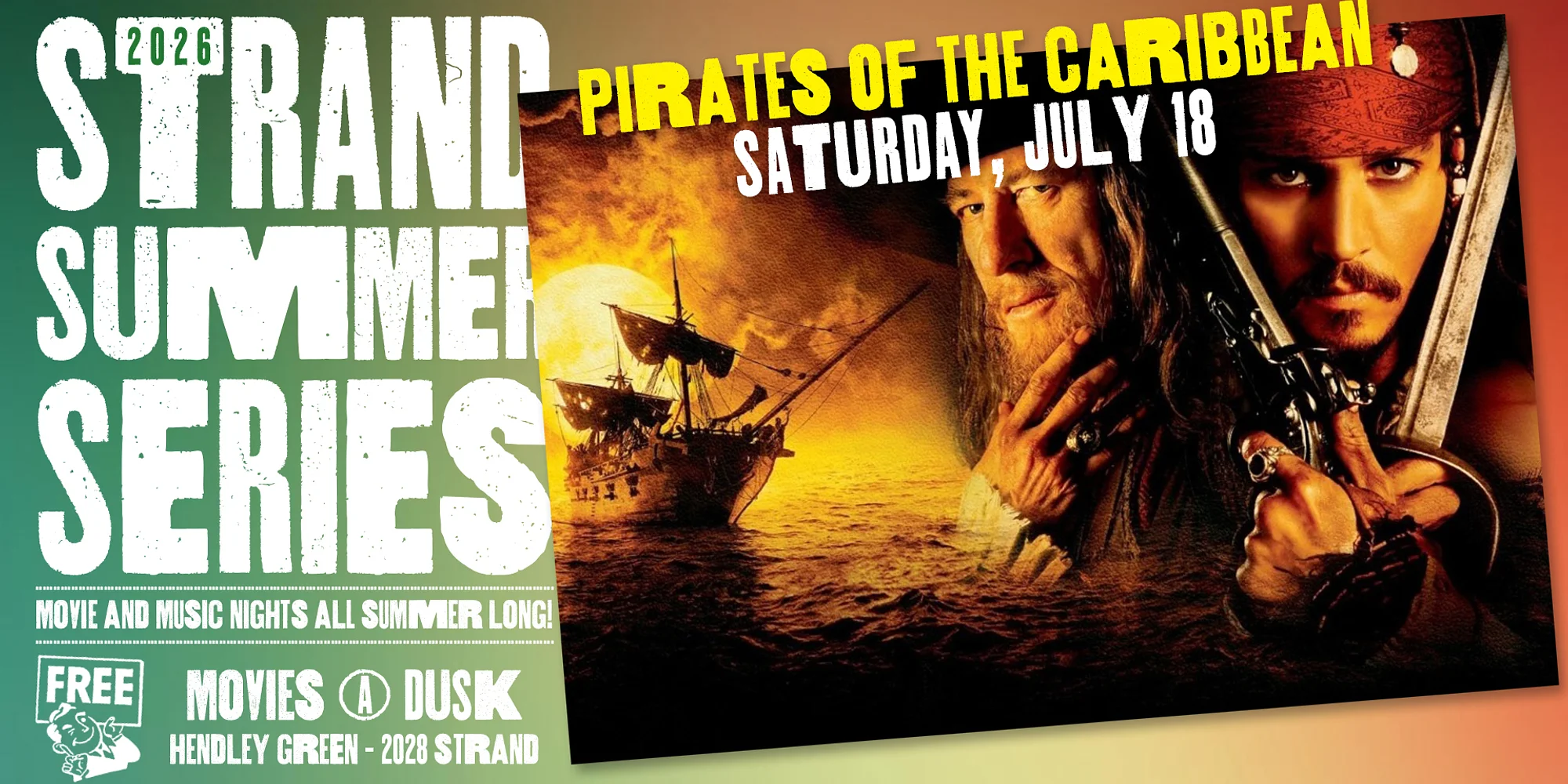 Galveston Historical Foundation invites you to enjoy historic downtown Galveston for the 2026 Strand Summer Series! These movie nights are held at Hendley Green and feature free films from April through September. ABOUT PIRATES OF THE CARIBBEAN | Capt. Jack Sparrow arrives at Port Royal in the Caribbean without a ship or crew. His timing is inopportune, however, because later that evening the town is besieged by a pirate ship. The pirates kidnap the governor’s daughter, Elizabeth, who’s in possession of a valuable coin that is linked to a curse that has transformed the pirates into the undead. A gallant blacksmith in love with Elizabeth allies with Sparrow in pursuit of the pirates.
