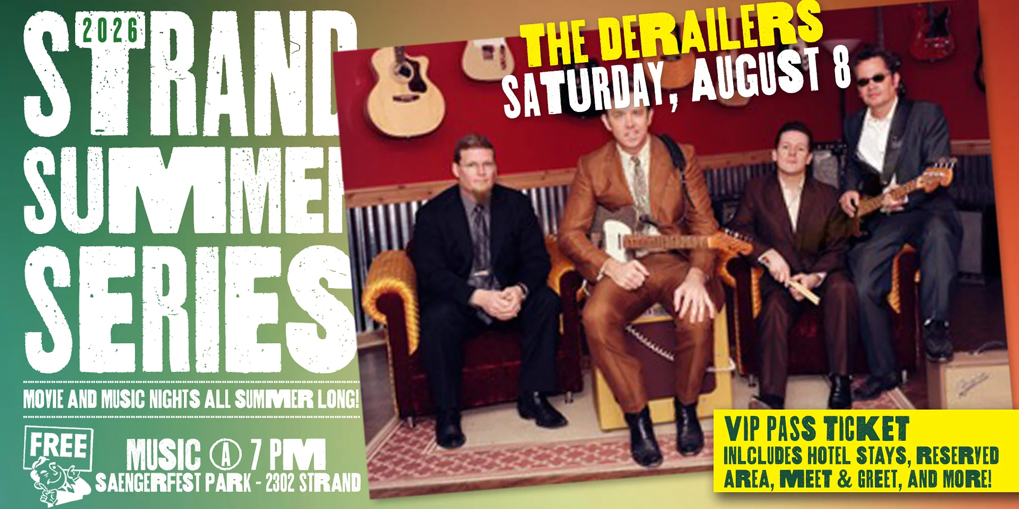 Galveston Historical Foundation invites you to enjoy historic downtown Galveston for the 2026 Strand Summer Series! These movie and music nights are located in The Strand’s principal parks and feature free-to-the-public concerts and movies from April through September. Performances are free to the public with on-site beer and wine, select vendors, and a reserved VIP area with reserved seating, complimentary drinks, meet and greets, and more. ABOUT THE DERAILERS | The Derailers are a high-energy country band known for their irresistible blend of honky-tonk, rockabilly, and roots-driven twang, channeling the spirit of classic country while delivering a fresh, road-tested sound. Formed in Texas and shaped by deep influences from Buck Owens, Merle Haggard, and the Bakersfield tradition, the band gained national attention with a string of acclaimed albums and charting singles in the late 1990s and early 2000s, including Reverb Deluxe and Here Come the Derailers. Celebrated for tight harmonies, infectious rhythms, and electrifying live shows, The Derailers have toured extensively and earned a loyal following by staying true to country music’s dancehall roots while keeping it loud, fun, and unapologetically authentic.