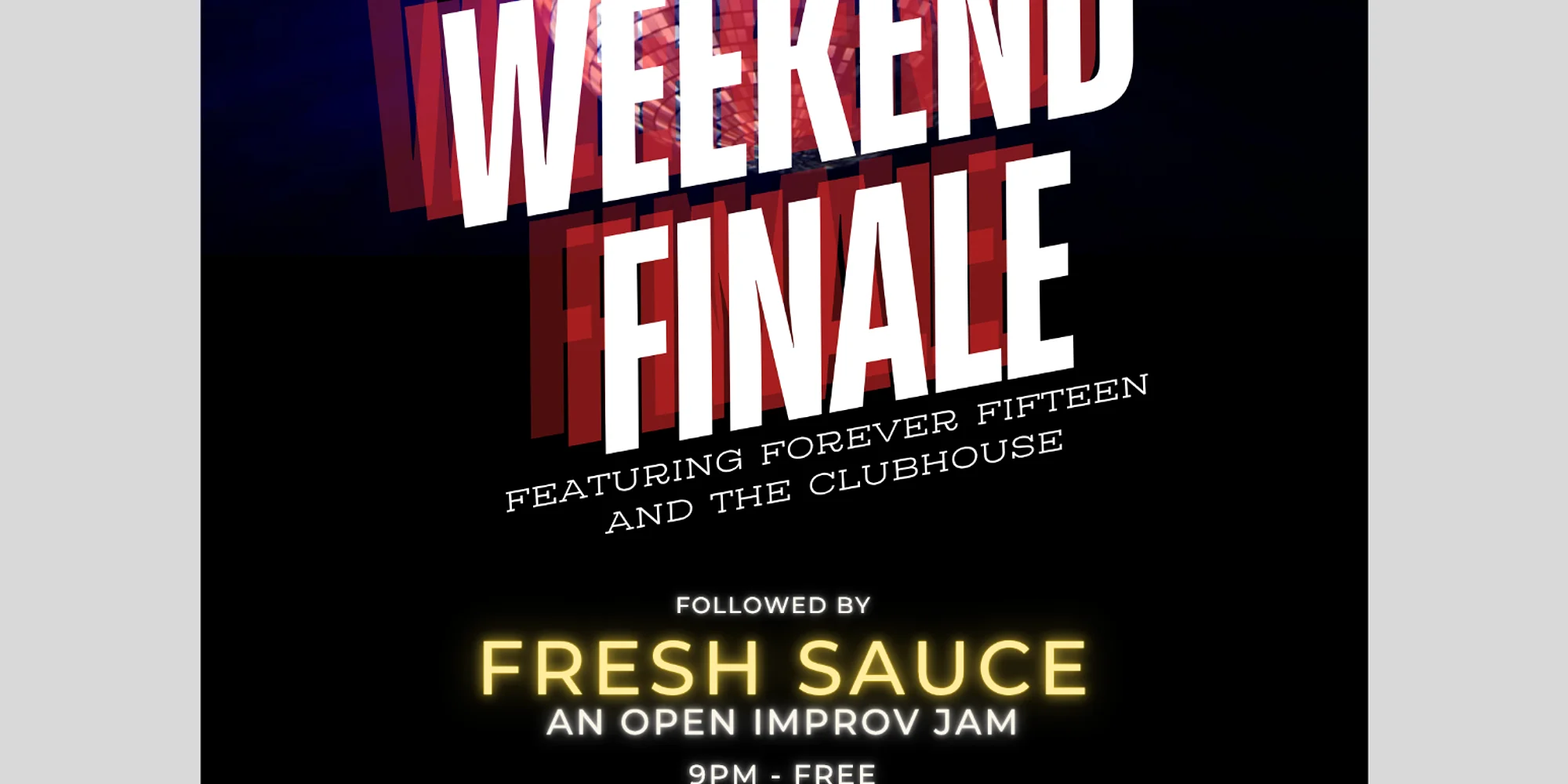Weekend Finale Four local improv troupes perform! Starring: Cartwheel, our newest launch group, Special guests and headlined by our long form house team, The Clubhouse. Stay late and play in Fresh Sauce: our free, open improv jam! Buy Tickets! GENERAL INFORMATION Pre-purchasing your tickets for shows is highly suggested. We recommend you arrive at least 15 minutes before showtime. There is drink service at your table throughout the show. SEATING Please choose your seat online. There will be ushers on staff to assist in finding your seat. We have limited seating and there may be more than one party per table. GROUP DISCOUNT If you purchase 12 or more tickets at once, a 10% discount will be automatically applied to your order. Please let us know if you experience any issues with this discount! PAYMENT Forms of payment accepted at the box office: CASH, VISA/MASTERCARD, AMERICAN EXPRESS, DISCOVER PARKING Free Parking is available in our lot and the Courthouse next door after 5 pm. Metered Parking is available on 9 Mile and in a lot across the street. The meter expires at 9 pm and is free on Sundays. other Attendees understand that there is an inherent risk of exposure to COVID-19 in any public place where people are present. Those purchasing or attending Go Comedy! Improv Theater events voluntarily assume all risks related to exposure to COVID-19.
