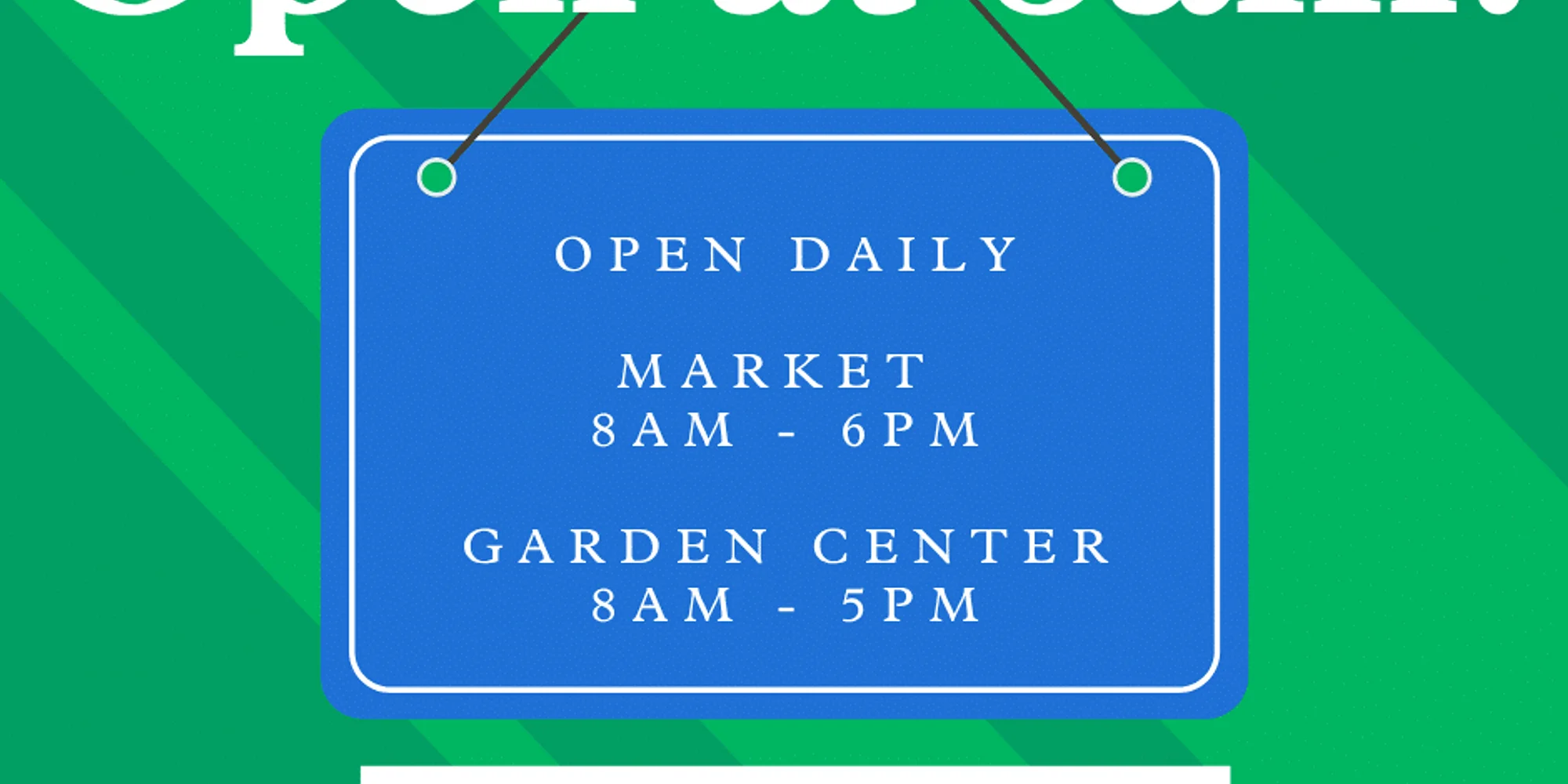 The market is now open 8-6 daily. The garden center is open 8-5 daily.