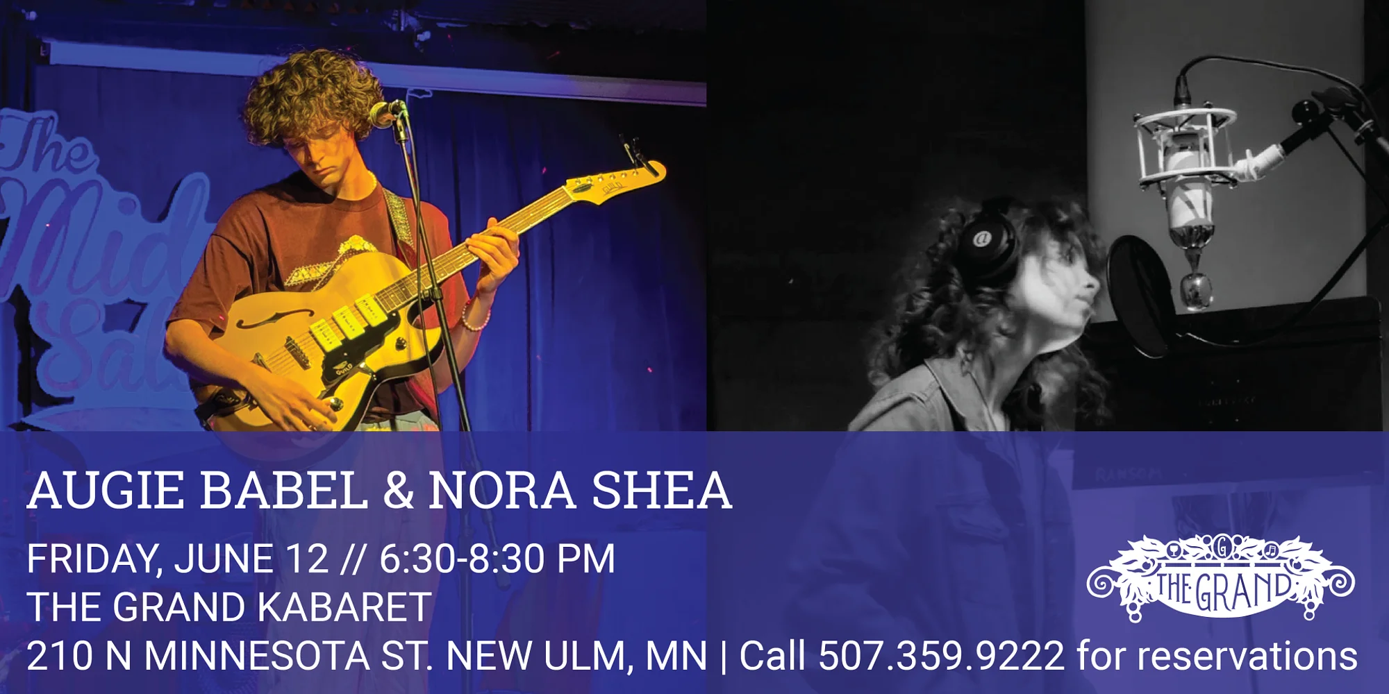 Augie Babel is a singer-songwriter based in Minneapolis, and was born and raised in New Ulm. His influences are a mixed bag of songwriters throughout the years including Marvin Gaye, Prince, and John Prine, as well as more contemporary artists in the mold of Amy Winehouse, Regina Spektor, and Feist. He’s excited to be back performing at The Grand again and is currently working on self producing his debut album. Follow along on @augiebabel on all streaming and social media platforms Norah Shea is a singer/songwriter from Roseville, MN. She is so thrilled to be performing at the Grand! Her influences include Joni Mitchell, Brandi Carlile, and Bob Dylan. She hasn’t released any music yet, (stay tuned), but you can follow her journey on instagram @norahshea