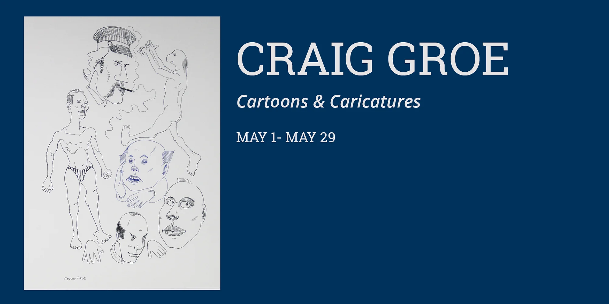 Bio: Craig Groe was born in 1959 in Austin, MN. He studied at Austin Community College from 1977-1978 and later at Mankato State University where he received his BFA in painting. Craig works across multiple art disciplines, including painting, drawing, sculpture, music, film, video and theatre. He is now retired from KEYC-TV in Mankato after 28 years as a commercial writer, producer, director and production assistant. Artist Statement: Cartooning, for me, is a type of visual diary. Although I don’t generally depict real people, my cartoons often contain bits and pieces of myself, friends, acquaintances and the famous. The cartoons and caricatures in this show are taken from my sketchbooks and other related drawings and paintings. Most of these images are spontaneously formed directly from my imagination. I use the distortions generated by this direct approach to incorporate a degree of randomness and freshness into the process. OPENING RECEPTION: Thursday, May 14th