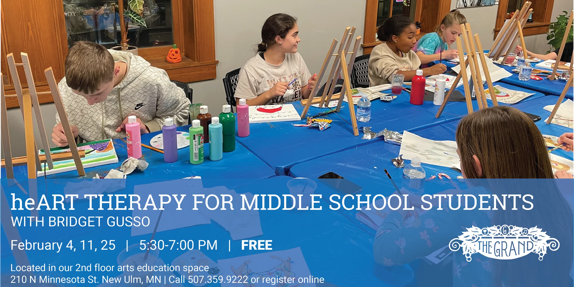 Taught by Bridget Gusso, these after school art classes aim to create space for middle school students to be creative outside of school. Bridget is a licensed art teacher who currently teaches at New Ulm Middle School. During these sessions, students will create projects led by Gusso and on their own using provided supplies. All sessions are free to attend! Students meet in our second floor arts education space, enter through the front or back door. Please register by purchasing a free ticket on this webpage, or by calling us at 507.359.9222