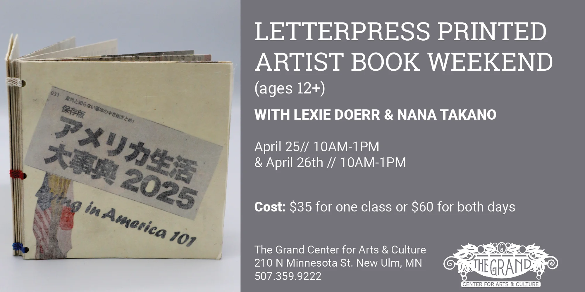 These letterpress printing and bookbinding workshops are intended to be complimentary: a two-workshop weekend! Participants will be able to use their prints made on the press in the book they bind. Register for one class or both! Day 1: Letterpress Printing with Alternative Materials On day one, create unique compositions with alternative materials on the letterpress! Participants will have a chance to embrace the element of play on the press, as they make their own prints using foam stencils to create layered imagery. Day 2: Wire-Edge Binding On day two, participants will be introduced to a simple but unique binding technique, wire-edge binding. This workshop will start with collage (paper, thread, dry flowers, and more). Wire will be used to bind the book together. The wire spine will be exposed on the inside of the book but covered with thread on the outside. Instructors: Lexie Doerr and Nana Takano Cost: $35 for one class or $60 for both days