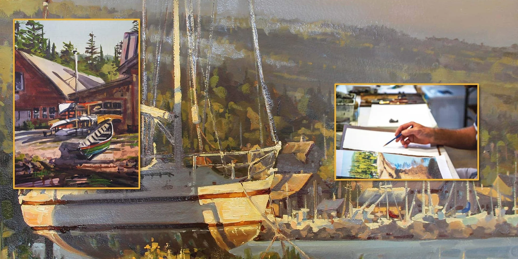 Gain a foundation in the visual language of watercolor with an emphasis on simplifying landscape subjects through large value shapes. Students will enjoy one full demo each day as well as paint one strategic follow along activity designed to speed up your understanding and abilities. Dan will bring optional photos to use but also strongly encourages you to bring photos that speak to you and inspire you to want to paint because there will be several hours each day to apply new knowledge and paint. Dan will guide students to use the damp paper method and class will be peppered with group discussion and one-to-one guidance. Students are asked to bring the following supplies Palette Dan uses a Quiller palette and a condensed palette (my plein-air palette) called En Plein Air Pro. Quiller Color Wheel Shows you the location of pigments on the color wheel. Paper Please bring cheaper watercolor paper for value studies, and good quality paper, 100% rag cotton in quarter sheet size, for paintings. I typically use arches 300lb rough or 140lb cold press and also rough texture. Arches 140lb cold press is a very commonly used and recommended paper. Dan will guide students to use the damp paper method by wetting the front and back of the paper before starting. This allows for longer “open time” to blend colors, get soft edges, and maximize the amazing textures inherent in watercolor. Paint Dan uses Winsor & Newton watercolor paints. I would strongly recommend having white gouache on your palette as well. Paynes Gray Ultramarine Violet Ultramarine Blue Cobalt Blue Cerulean Blue Cobalt Turquoise Viridian Cadmium Free Yellow Pale Naples Yellow Winsor Orange Burnt Sienna Cadmium Free Red Permanent Rose Titanium White Brushes Use what you’re comfortable with; I use a combination of flats and rounds, both synthetic and natural hair. Several options are listed for brushes, one for each size is fine. Large Brushes Princeton Neptune Quill 8 Black Velvet Jumbo Round, LG Da Vinci Casaneo, 6 Medium Brushes Princeton Neptune Round 14 W/N Synthetic Sable Round 14 Rosemary Brushes: Series 99, #14 size Series 99, #12 size Small / detail Brushes Princeton Velvetouch, Long Round, size 12 Miller’s Golden Fleece Rigger, size 1 Misc Continuous Sprayer (Pick whichever you like, they are all pretty much the same) HB pencil and kneaded eraser Masonite sealed with 2 clearcoats or plexiglass Natural sponge for wetting the front and back of the paper Water container Household sponge, rags, paper towels Masking Tape Photographs and sketches to work from