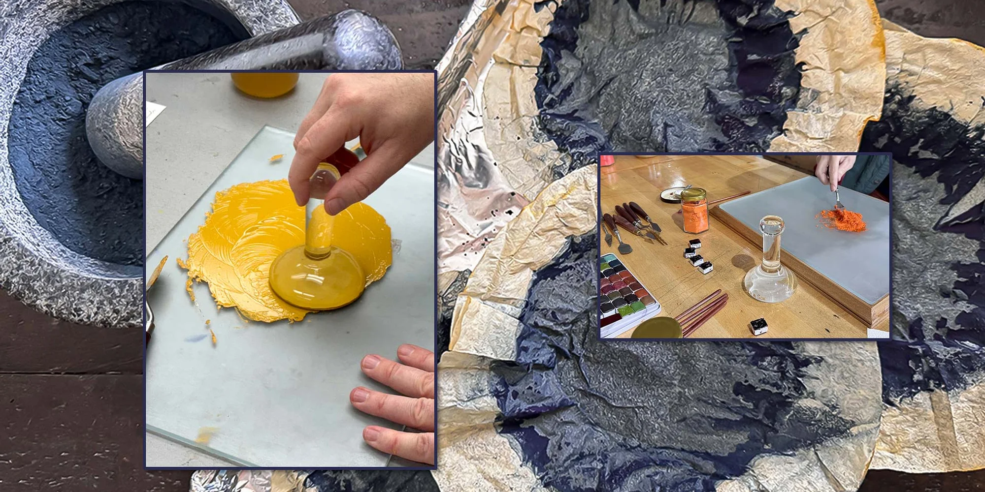 Students will learn the fundamental process of creating their own watercolor paints from scratch. This will include grinding pigments, mixing with a binder, filling half pans, and formulating their desired color palettes. We will take a look at the properties of different pigments and how they behave. We will explore various watercolor techniques and create a collection of reference swatches. Allison will guide the class through a basic flat wash, a graded wash, wet-on-wet, wet-on-dry, blending, sponge, scumbling, splattering, underpainting, layering, lifting, pulling paint, resist techniques, and more. This workshop is open to ages 15+ Students are asked to bring the following supplies Sketchbook or notebook for taking notes Writing/drawing tools Apron Your supply fee will cover the following Pigments Watercolor paper and swatch charts Binder ingredients Empty half pans and tins Use of my glass slabs, paint mullers, palette knives, brushes, tape, watercolor mediums, and other additives.