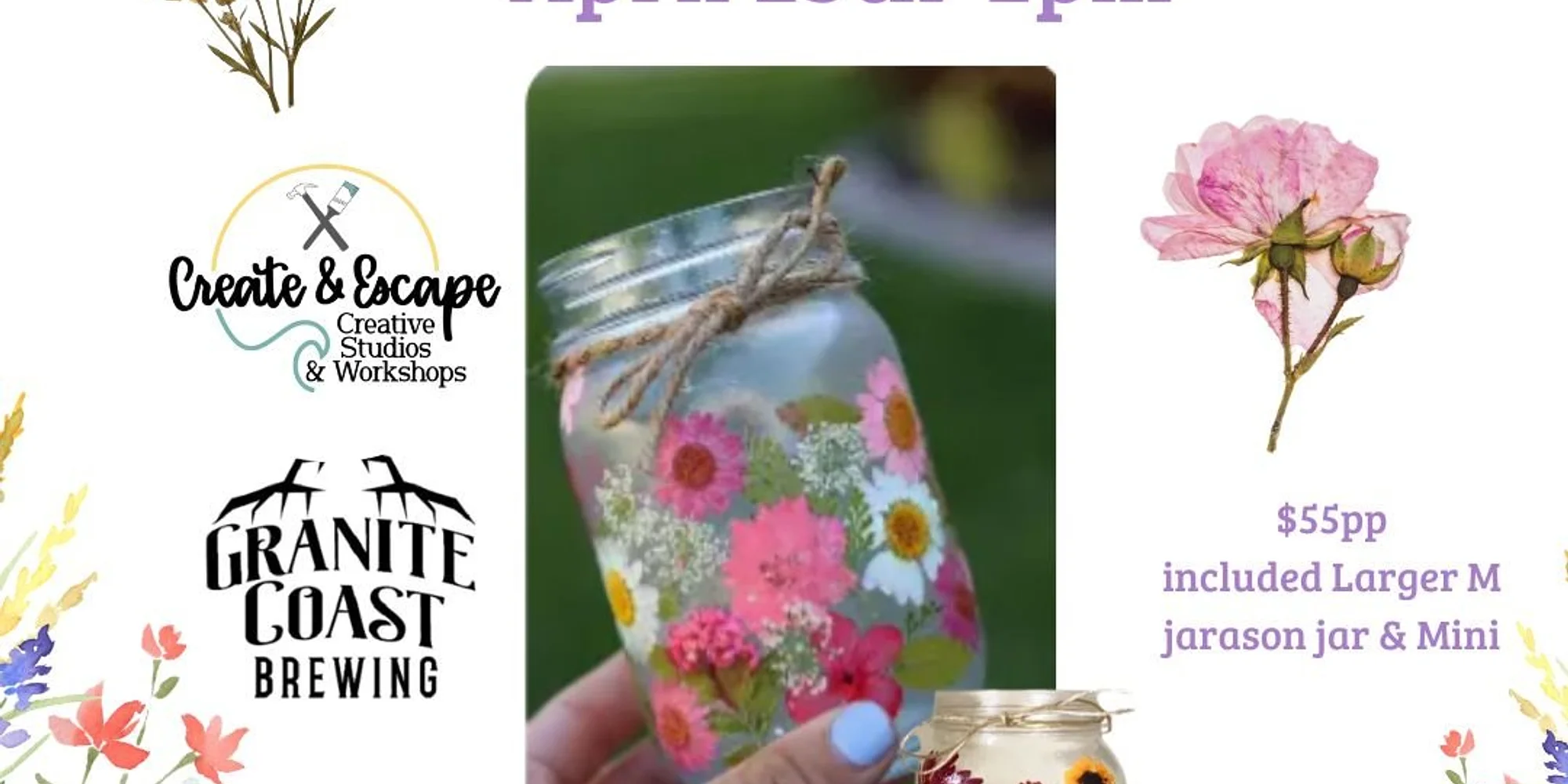 Join us for a family friendly creative event at Granite Coast Brewing for pressed flower jars — a relaxing DIY workshop where you'll create beautiful floral jars to take home. Get tickets In this hands-on workshop you can make two beautiful projects using dried pressed flowers- a large and small jar. No experience is needed — we guide you step-by-step and encourage you to get creative with your design. 🎟 Includes: 🎨 All supplies + step-by-step instruction (Includes your full project + a drink!) Alcoholic beverages for 21+ only. Non-alcoholic drinks are available. ✨ No experience needed — just come ready to have fun! ✨ Perfect for friends, families & creative evenings Spots will fill up — come sip and create something you’ll love! 💛 Questions? Contact createandescape@outlook.com